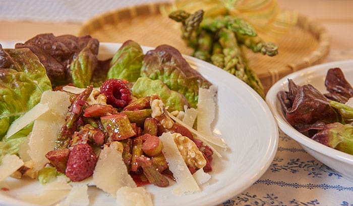 Die Himbeer-Vinaigrette zugeben, kurz aufkochen lassen, dann vom Herd nehmen. Den Spargel darin 1 Stunde ziehen lassen.