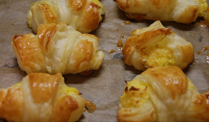 Blätterteig in 12 Teile schneiden (wie Tortenstücke), auf jedes Stück eine Portion der Kürbismischung geben und zur Mitte einrollen.