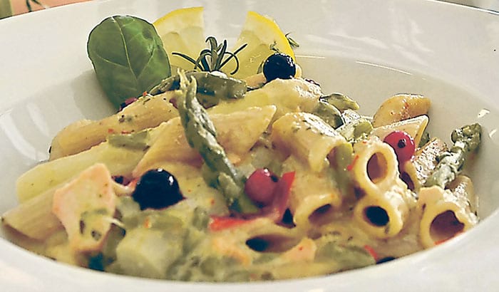 Das Gericht mit den restlichen Kräutern und den Beeren bestreuen und servieren.
