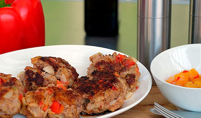 Die Mini-Hackbällchen in heißem Öl goldbraun braten und mit dem Aprikosen–Dip servieren.