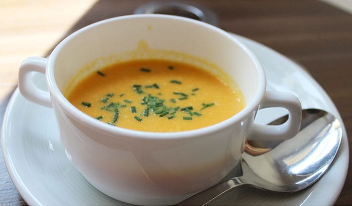 Danach mit dem Pürierstab pürieren und Crème fraîche dazugeben. In einer Schüssel anrichten und mit Dill oder Petersilie dekorieren.