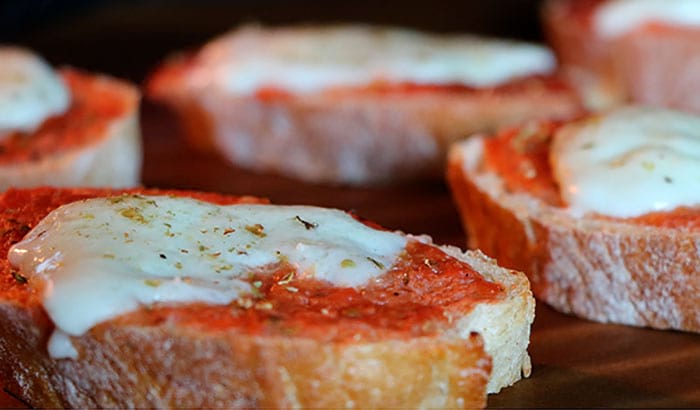 Darauf dann die Mozzarella-Scheiben legen. Für fünf Minuten bei 180 Grad in den Backofen, bis das Brot kross und der Mozzarella zerlaufen ist.