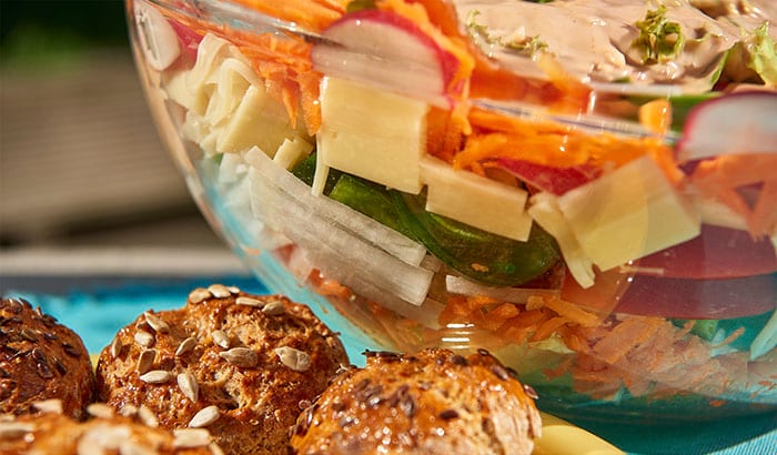 Die Salatzutaten schichtweise in eine Schüssel geben. Die Mayonnaise mit dem Joghurt, dem Obstessig, dem Tomatenketchup und dem Johannisbeergelee glatt rühren.