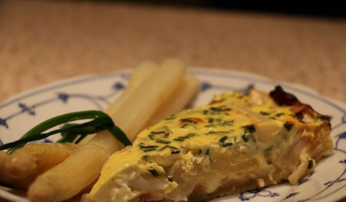 Für die Füllung zunächst den Schinkenspeck fein würfeln. Eine Pfanne mit Butterschmalz erhitzen, den Speck darin anrösten und ihn zusammen mit dem Spargel auf dem Teig verteilen. Anschließend Eier und saure Sahne in einer Schale verrühren, Schnittlauch geschnitten hinzugeben, kräftig mit Salz, Pfeffer und Muskat abschmecken und über den Spargel gießen. Die Form in den vorgeheizten Backofen stellen.