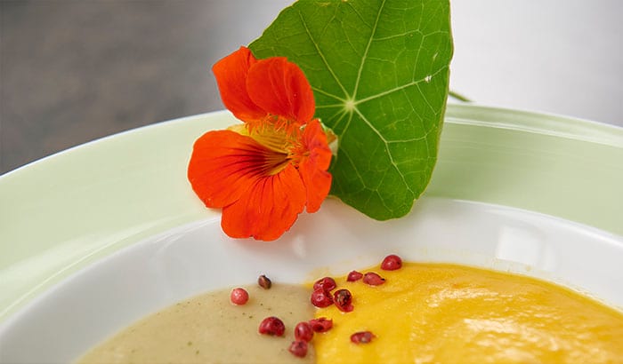 Mit Kresseblättchen bestreuen und jeden Teller mit einer Kapuzinerkresseblüte garnieren.