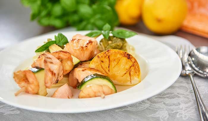 Abwechselnd Lachs, Garnelen und Zucchini auf Holzspieße stecken. Die Zitronen waschen und halbieren.