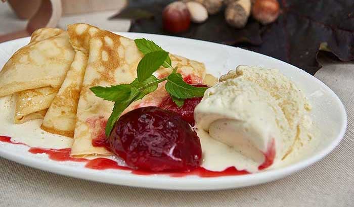 Eine Pfanne erhitzen und Butterschmalz darin verteilen. Mit einer Kelle Teig in die Pfanne gießen und dabei die Pfanne drehen, damit der Boden gleichmäßig dünn bedeckt wird. Crêpe wenden und von