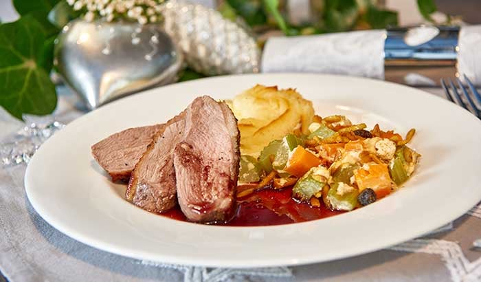 Die Entenbrüste leicht salzen und mit der Soße und Orangenscheiben anrichten. Dazu Kartoffelsoufflé und Selleriegemüse servieren.