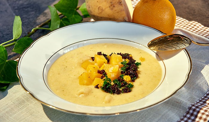 Mit Salz, Pfeffer und geriebener Muskatnuss abschmecken. Mit der Pumpernickel-Mischung, Kartoffel- und Steckrübenwürfeln sowie der restlichen Orangenschale anrichten.