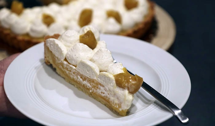 Den Prosecco-Pudding über die Mangostreifen geben und die Tarte bei 160° C auf mittlerer Schiene 40 Minuten backen. Abkühlen lassen und über Nacht (oder mindestens für fünf Stunden) in den Kühlschrank stellen.