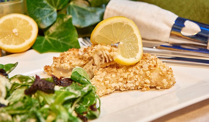 Die Fischfilets kalt abwaschen und gründlich trocken tupfen. Die Filets zunächst in der Mehlmasse wenden, überschüssiges Mehl vorsichtig abklopfen. Den Fisch anschließend in der Ei-Mischung und in den Mandelbröseln wenden, dabei die Mandeln gut festdrücken.