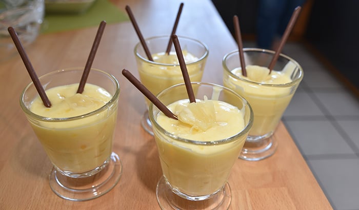 Ananasscheiben in Stücke schneiden und unter die Creme heben. In Portionsschälchen füllen und kühl stellen.