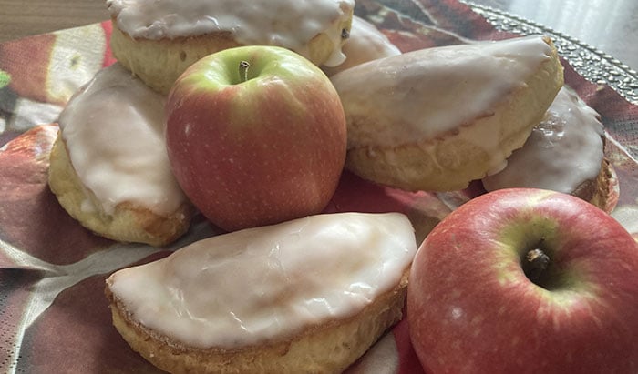 Den Teig auf einer bemehlten Arbeitsfläche flach ausrollen und mithilfe einer Untertasse kleine Kreise mit etwa zehn Zentimetern Durchmesser ausstechen. Etwa einen Esslöffel der Apfelmischung auf eine Hälfte des Teigkreises geben und die andere Teighälfte darüber klappen. Die Ränder der Taschen mit den Fingern zusammendrücken und die obere Hälfte mit Milch bestreichen. Das Gebäck danach auf ein Blech legen und etwa 15 Minuten bei 200 °C Ober-/Unterhitze im vorgeheizten Ofen backen.