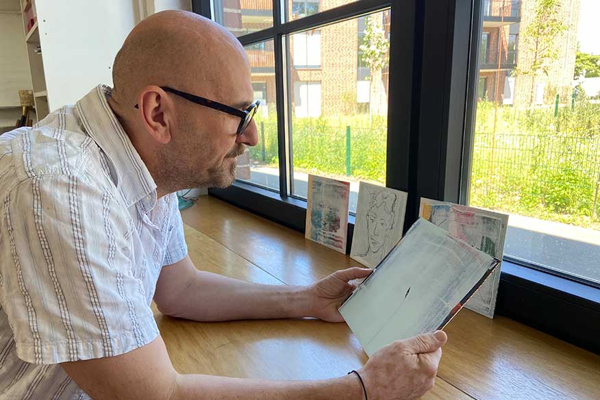 Und wie lässt es sich hier wirken? Um eine kleine Demonstration ihrer Arbeitsweise gebeten, zögert die Künstlerin nicht lange. Nimmt an ihrem Arbeitstisch Platz, legt den Kopf auf einen weißen Bogen Papier und umreißt mit dem Zeichenstift mehrfach das eigene Profil. Ein konturenhaftes Selbstporträt entsteht. Eines von vielen, die hier in einem Grafikständer inmitten des Raums zu finden sind.