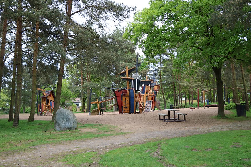 Es geht am Warendorfer Freibad vorbei, auf einer Brücke über das Wasser auf die andere Seite des Ufers. Nur wenige Meter weiter schimmern schwarze Segel durch die Bäume hindurch, am Masten prangt die berüchtigte schwarze Fahne mit einem weißen Totenkopf: Ein verlassenes Piratenschiff wartet darauf, erobert zu werden. Ein Spielplatz, der nicht nur die Kinderherzen höherschlagen lässt, lockt mit Klettergerüsten, Sandkasten, Schaukeln und Wippen.