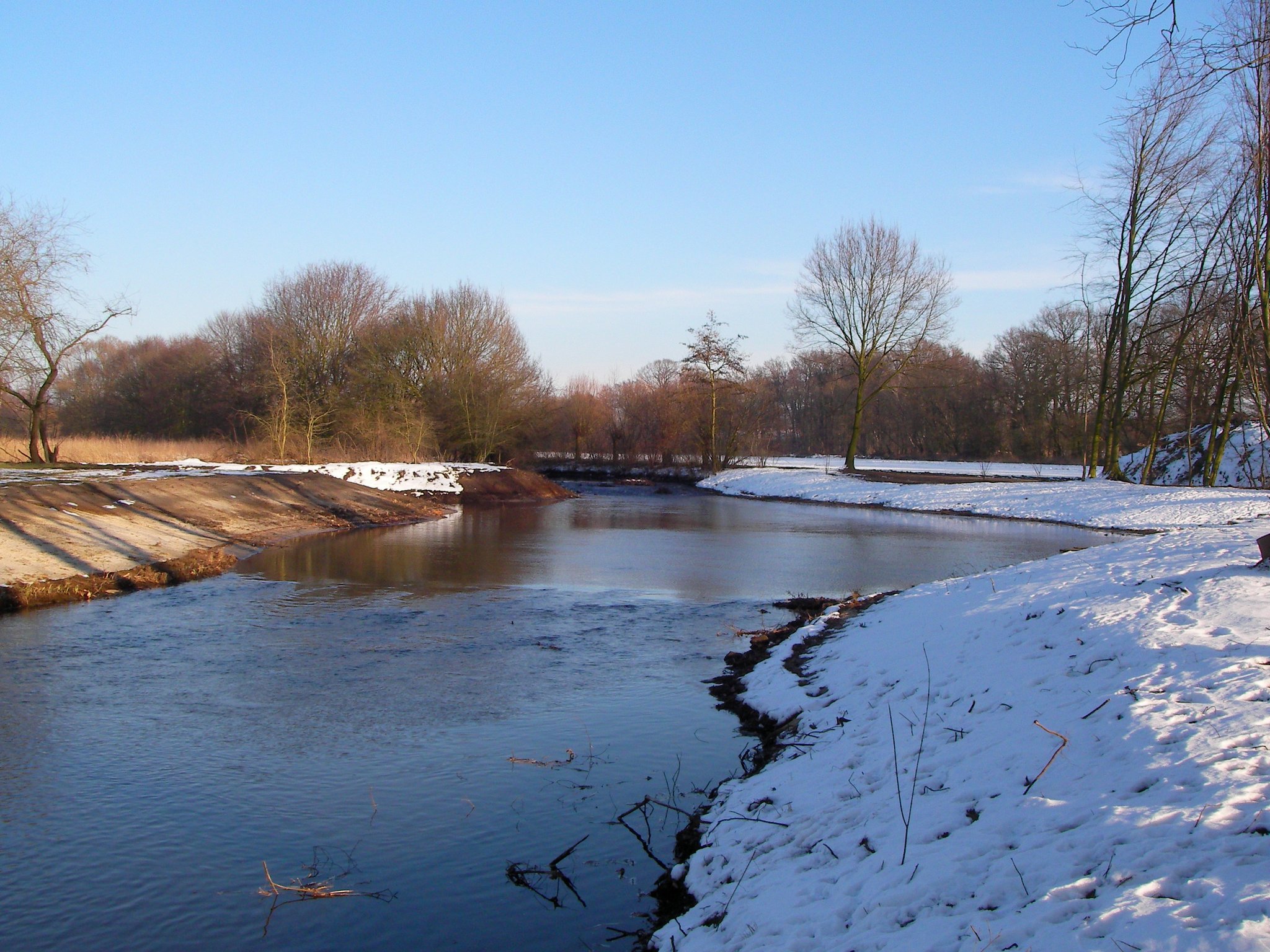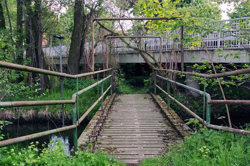 Zurück in der Spur müssen wir die Delbrücker Straße kreuzen, um auf den Emsradweg zu gelangen. Direkt an der Stelle, an der in der Rietberger Emsniederung (25,7 km) der Fluss überquert wird, staut eine kleine Schleuse das Wasser an der Antfänger Mühle. Der Name „Antfänger“ bedeutet „Entenfänger“ und gibt einen Hinweis auf den einstigen Wildentenfang. Pro Tag, vermuten Heimatforscher, wurden seinerzeit um die 50 Wildenten gefangen, die bis nach Holland verkauft wurden. Mit Beginn der Emsregulierungen in den 1930er-Jahren blieben die Wildenten jedoch aus. Die Fangstelle verfiel. Das Mühlengeschäft selbst florierte bis Mitte der 1950er, seit 1975 stehen die Räder der Mühle still. Heute ist ein Bio-Bauer in dem denkmalgeschützten Natursteinbau tätig.