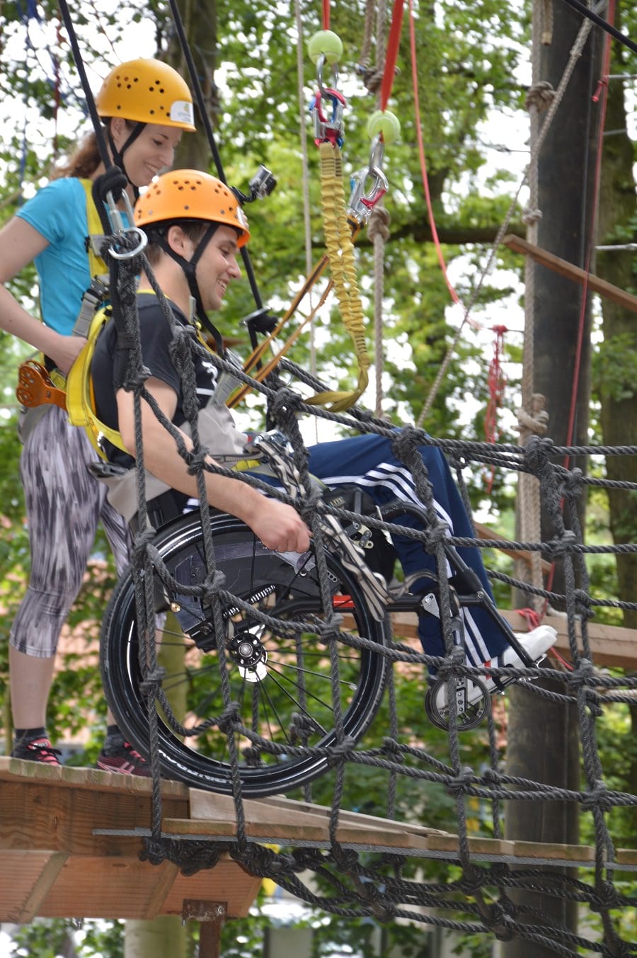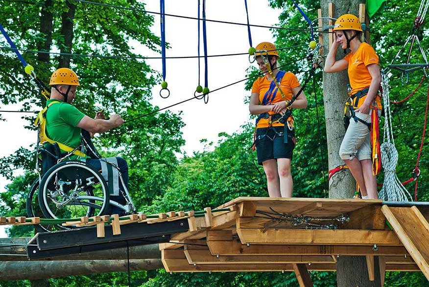 Frei schweben, durch die Luft sausen oder über eine Rampe in die Höhe klettern: Das ist in dem Klettergarten auch für Menschen mit Behinderungen möglich. „Die 43 Meter lange Seilbahn kann man beispielsweise sitzend, liegend, aber auch mit dem Rollstuhl nutzen“, erklärt Thomas Woesthoff, pädagogischer Leiter von Grenzenlos. Und: „Was mit dem Rollstuhl geht, geht auch mit dem Rollator.“ Ebenso können Gehörlose und Blinde den Parcours zwischen den Bäumen erklimmen. Zugleich betont der Sozial- und Erlebnispädagoge, dass die Elemente auch für Menschen ohne Einschränkungen durchaus anspruchsvoll sind. Wer drei Stunden klettere, sei anschließend körperlich geschafft.