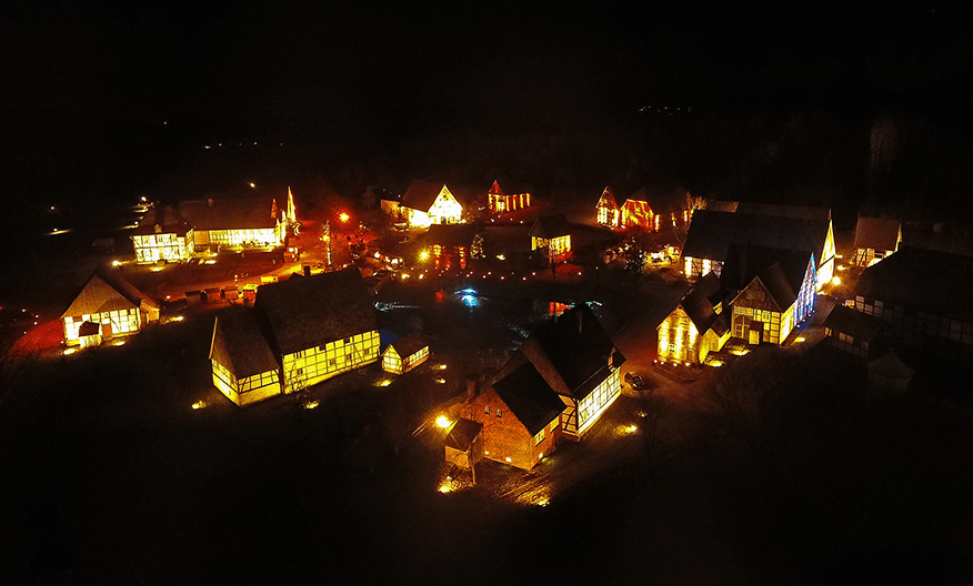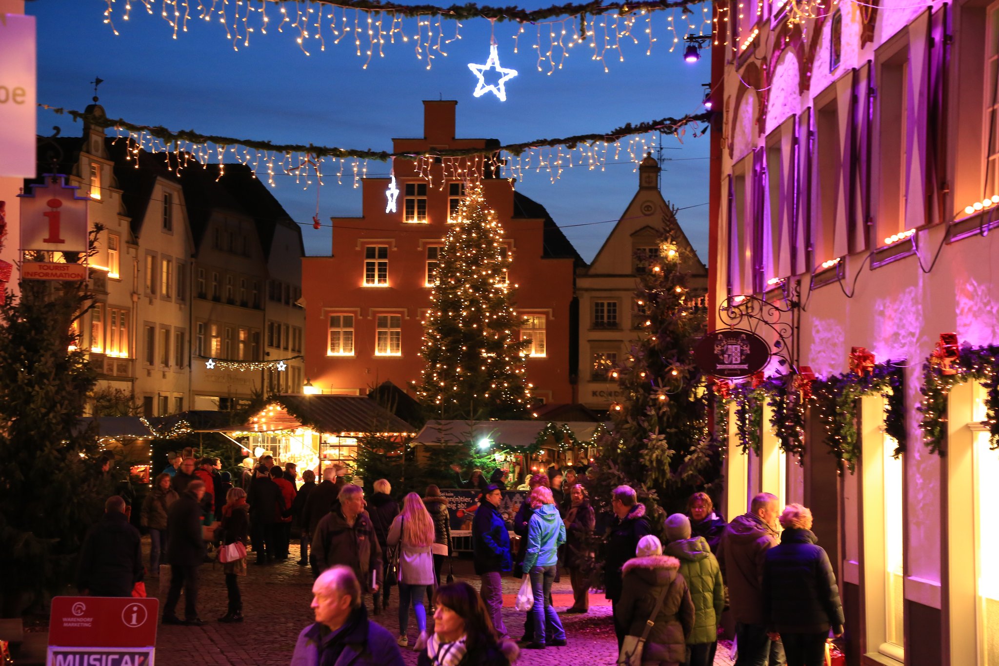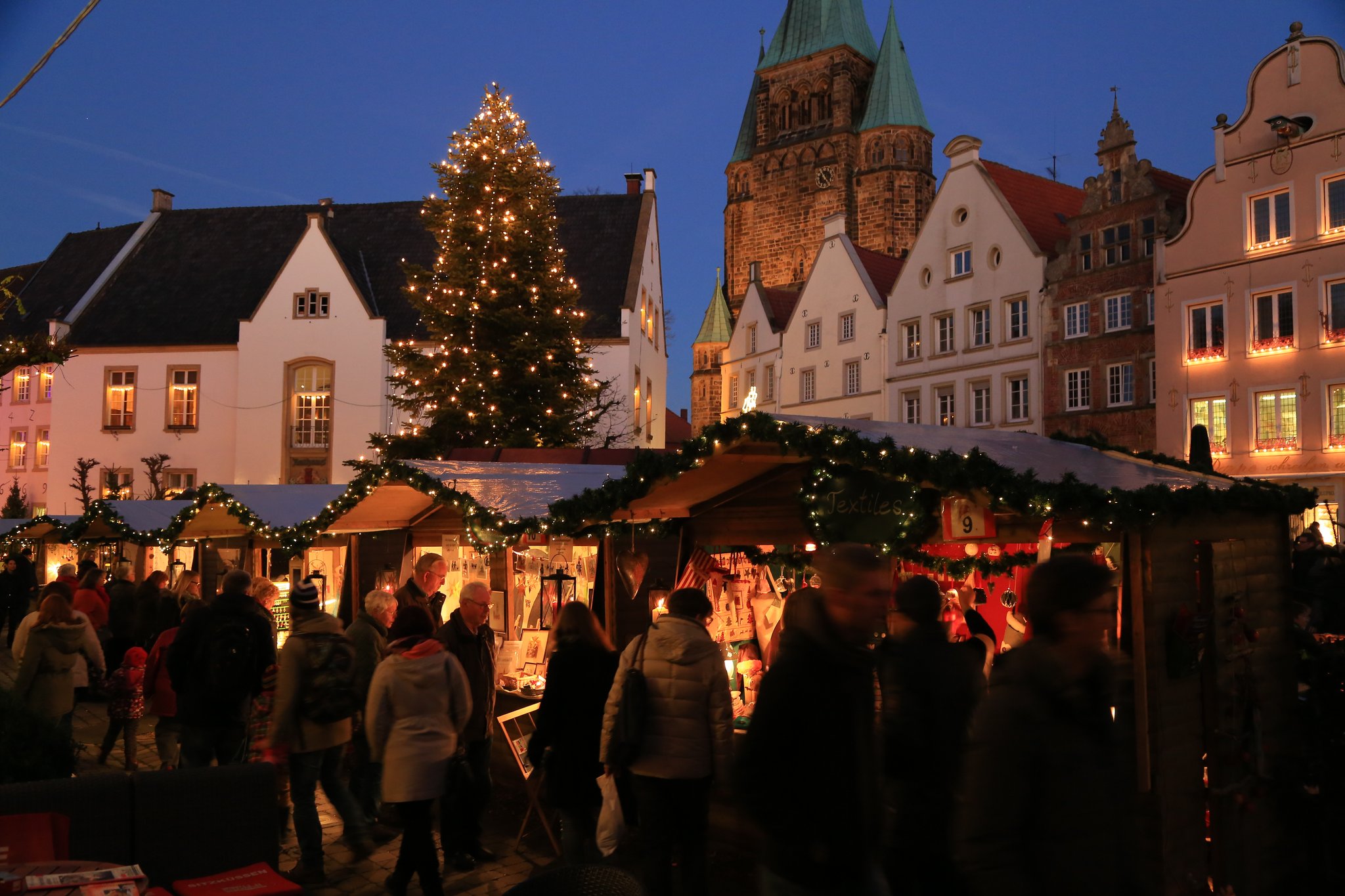 Bricht die Dunkelheit über die Stadt hinein, lohnt es sich, zurück nach Wiedenbrück zu gehen. Auf dem von Fachwerkhäusern eingerahmten Marktplatz findet alljährlich der Christkindlmarkt (21. November bis 23. Dezember) statt. Erleuchtet von zahlreichen Lichtern versetzt der traditionelle Budenzauber die Besucher in weihnachtliche Stimmung. Ob Räuchermänner oder Engel, Krippen oder Spielzeug aus Holz: Viele schöne Dinge werden angeboten. Und mit ein bisschen Glück trifft man dort auch auf das Christkind.