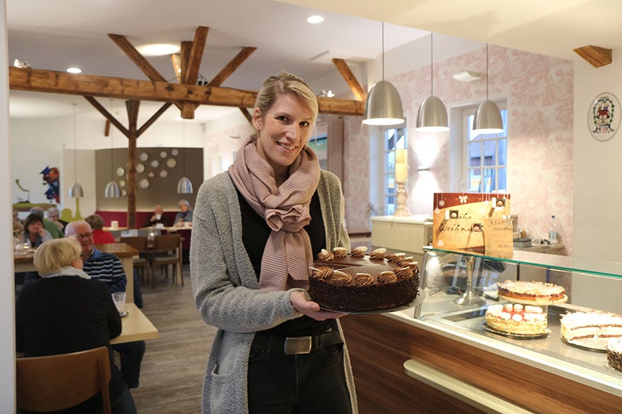 In der Nähe der Weberei erwartet Christine Riegler die Spaziergänger im Café Bohne mit Kaffeespezialitäten und ausgefallen Teesorten. Ganz besonders angezogen werden viele Gäste von den himmlisch duftenden und frisch gebackenen Kuchen- und Gebäckvariationen der gelernten Konditorin, die sich vor knapp zehn Jahren einen Lebenstraum mit dem eigenen Café erfüllt hat.