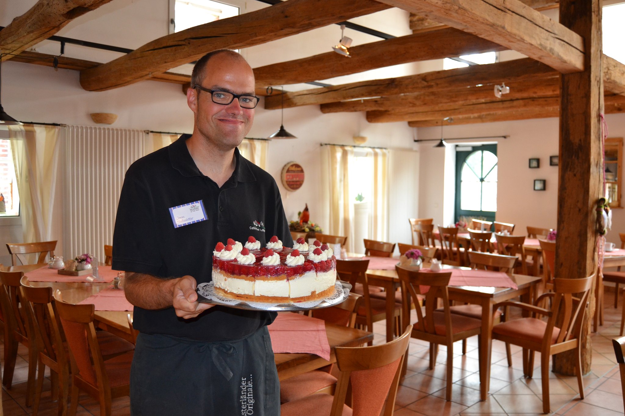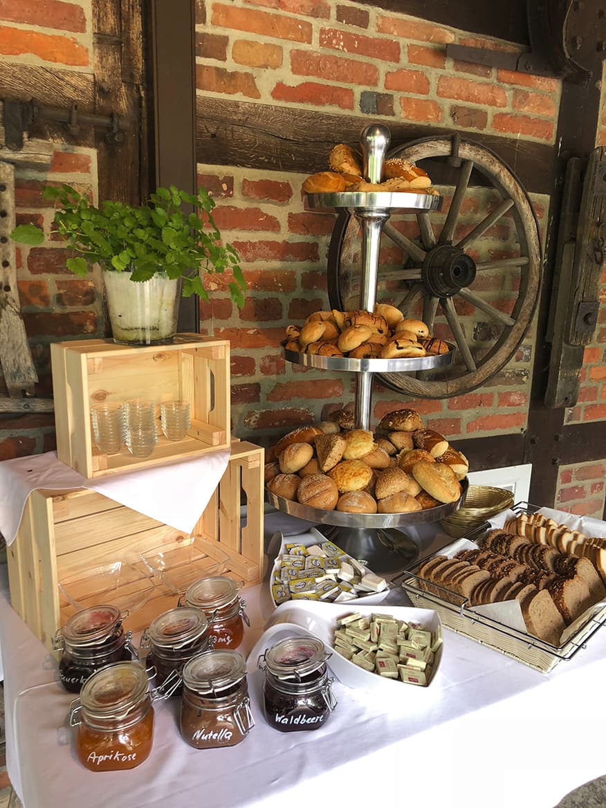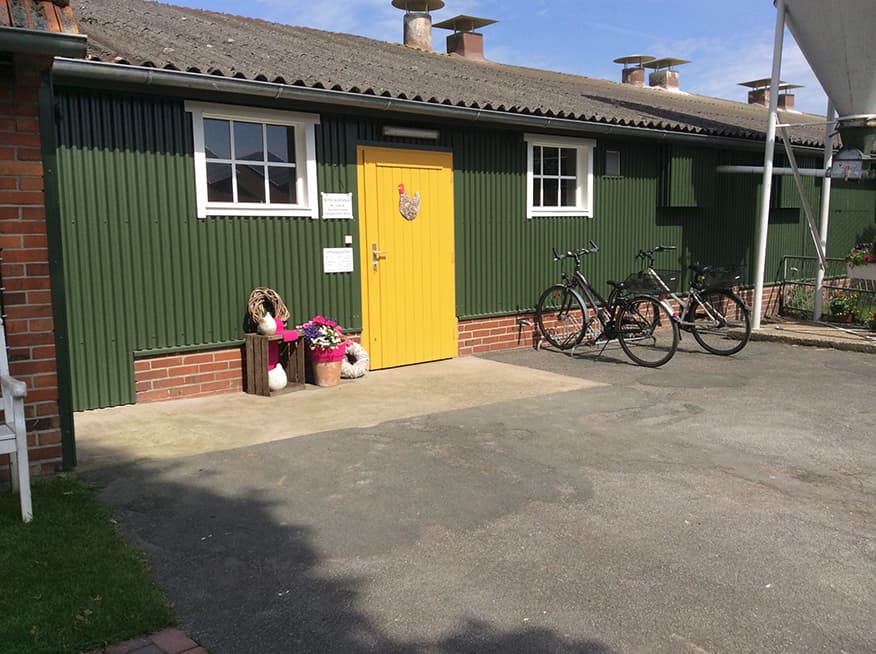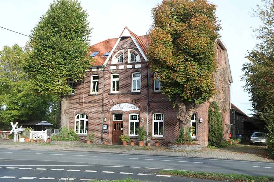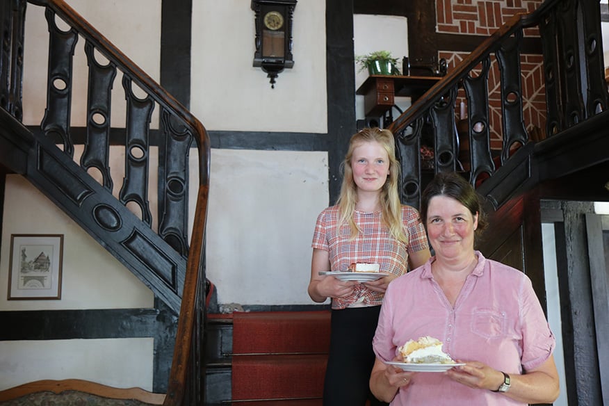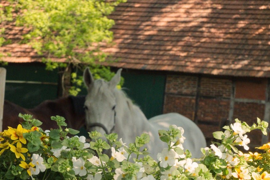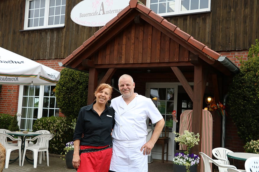 Nach einer kurzen Pause geht es weiter. Das nächste Ziel: das Bauerncafé Austermann. Dort ist nicht nur ein Parkplatz für Autos und Fahrräder, sondern auch ein Balken für Pferde. „Es kommt häufiger mal vor, dass Reiter bei uns Halt machen“, sagt Stefan Brune, gemeinsamer Inhaber mit seiner Frau Martina. Die beiden führen das Gasthaus seit Januar 2017. Wer bei ihnen einkehrt, der merkt schnell, dass sich einiges ums Pferd dreht. Denn: Direkt an das Café angeschlossen ist eine Reiter-Halle. Gäste erwartet nicht nur ein Blick auf die trainierenden Reiter, sondern ebenso ein reichhaltiges Frühstücks-Buffet am Morgen und frei wählbare Speisen ab Mittag. Besonders zur warmen Jahreszeit lädt die Sommerterrasse mit 120 Plätzen zum Verweilen an.