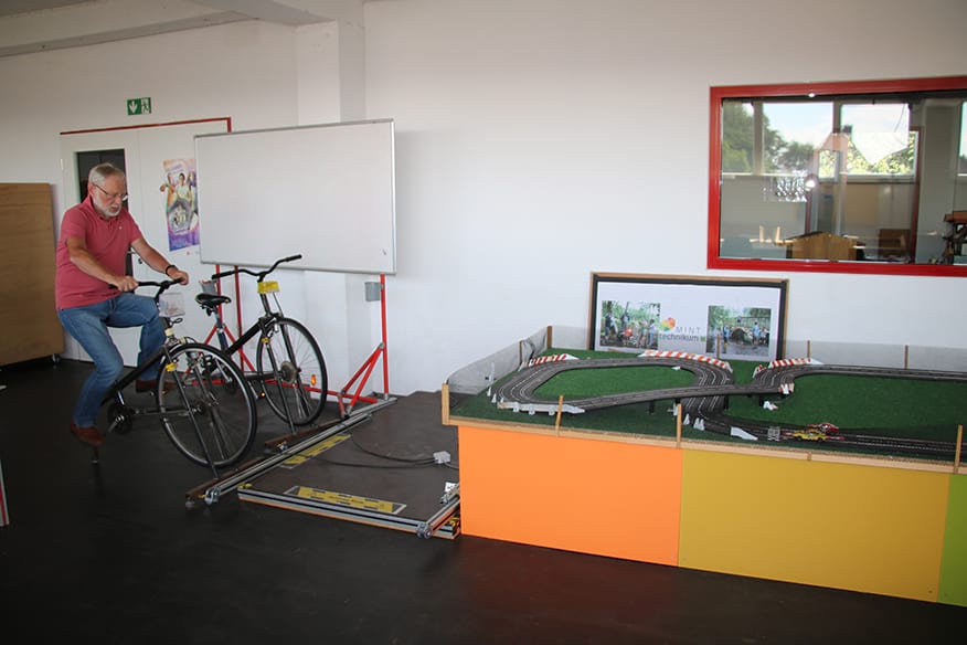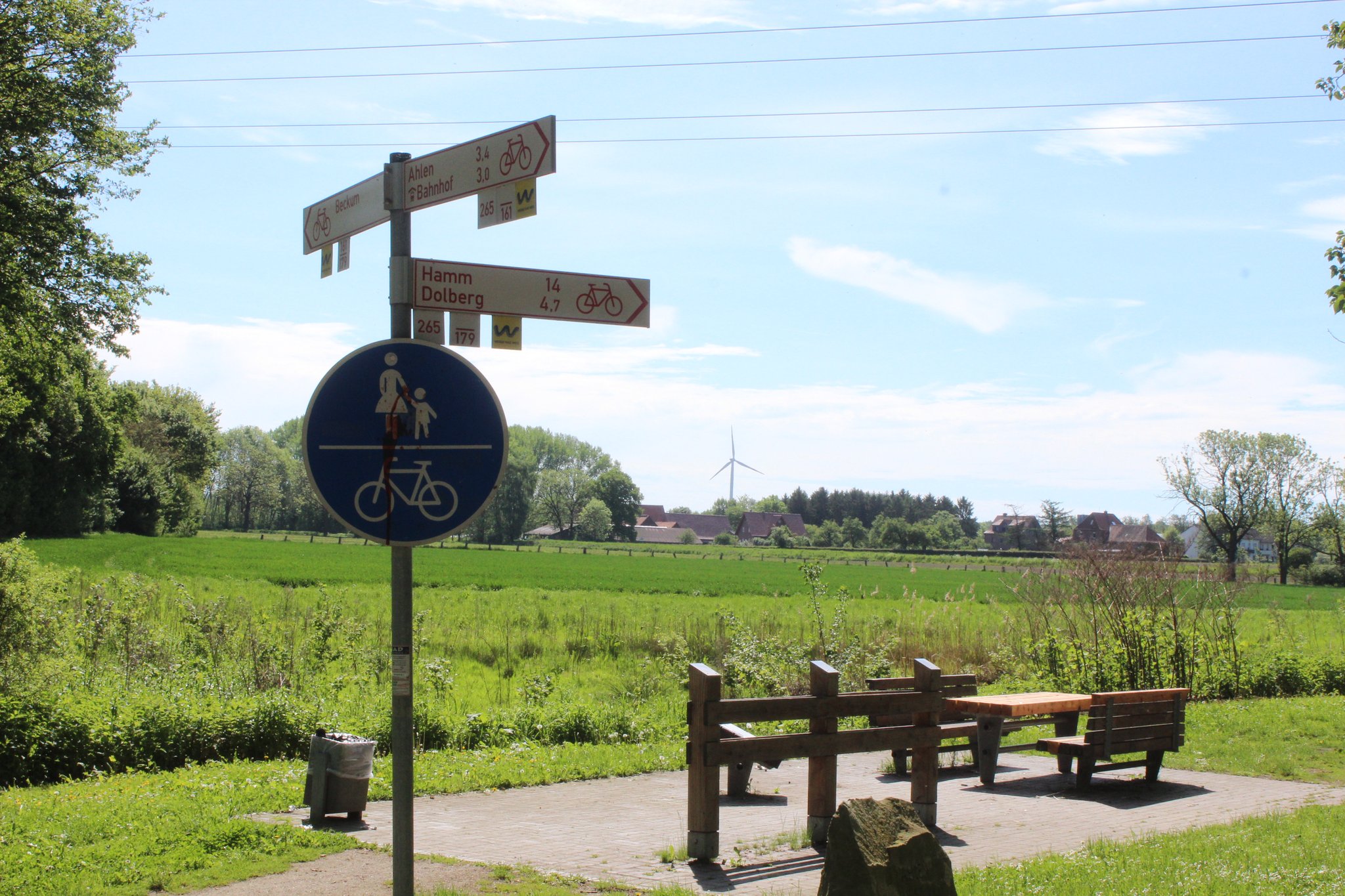 Zu Füßen des Turms startet die hierzulande-Tour, aber nach 100 Metern heißt es absteigen, die Strecke führt vor einer Gaststätte über einen kurzen Fußweg. Anschließend sitzen wir aber fest im Sattel. Die Radfahrer verlassen den Ort in östliche Richtung, eine Brücke erleichtert die Querung der viel befahrenen Bundesstraße 55.