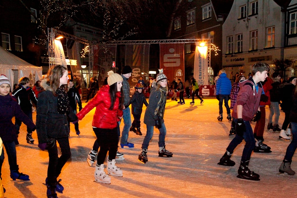Glänzend schimmert die Eisfläche auf dem Marktplatz in Beckum in der Zeit vor und nach Weihnachten. Vom 8. Dezember bis 8. Januar geht es dort rasant zu, wenn die Eisbahn ihre Pforten öffnet. Dann tummeln sich wieder von früh bis spät viele kleine und große Kufenfl itzer auf dem Eis im Schatten des Beckumer Stadtmuseums. Mehr als 300 Quadratmeter misst die Fläche und bietet so ausreichend Platz fürs Schlittschuhvergnügen.