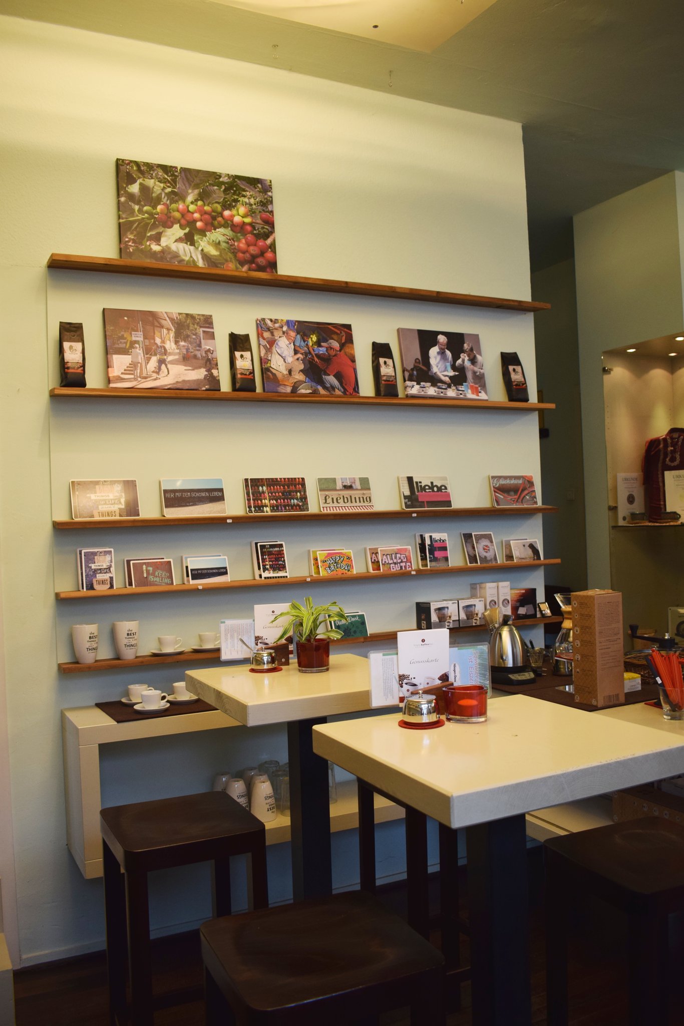 Fotos von Besuchen unter anderem in Nicaragua zeugen an den Wänden von dem direkten Kontakt, den Reinhold Schmelter zu den Kaffebauern pflegt, und lassen seine Begeisterung für das Handwerk spürbar werden. Zum gleichmäßigen Rauschen der Kaffeebohnen im Röster bietet sich bei einem Besuch die Gelegenheit, einen der selbstgebackenen Kuchen zu probieren. Vor allem trockenes Gebäck, vieles mit Schokolade, steht zur Auswahl. „Alles ist auf unsere Kaffeespezialitäten abgestimmt“, erklärt Schmelter. „Und Schokolade harmonisiert nun einmal sehr gut mit Kaffee“, fügt er mit einem Augenzwinkern hinzu.