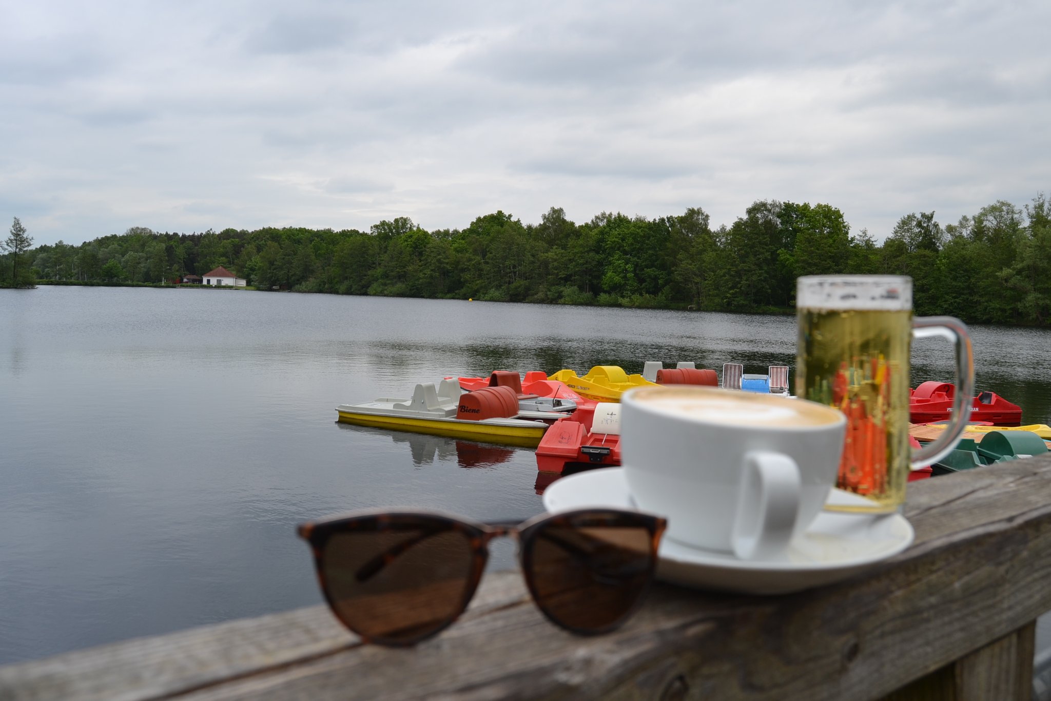 Gestärkt steigen die Reisenden wieder auf die Drahtesel. Entlang von Wiesen und Wäldern geht es weiter in Richtung Versmold. Fröhlich flöten und zwitschern Vögel vor sich hin, begleiten die Radfahrer auf ihrem Weg. Die Wege sind ruhig, kaum ein Auto fährt vorbei. Das Schild „Willkommen im Kreis Gütersloh“ ist schon passiert. Vorbei an einer Minigolfanlage geht der Asphalt in Schotter über: Um die Kurve und schon fällt der Blick auf einen See, umlagert von Zelten und Campingfässern.