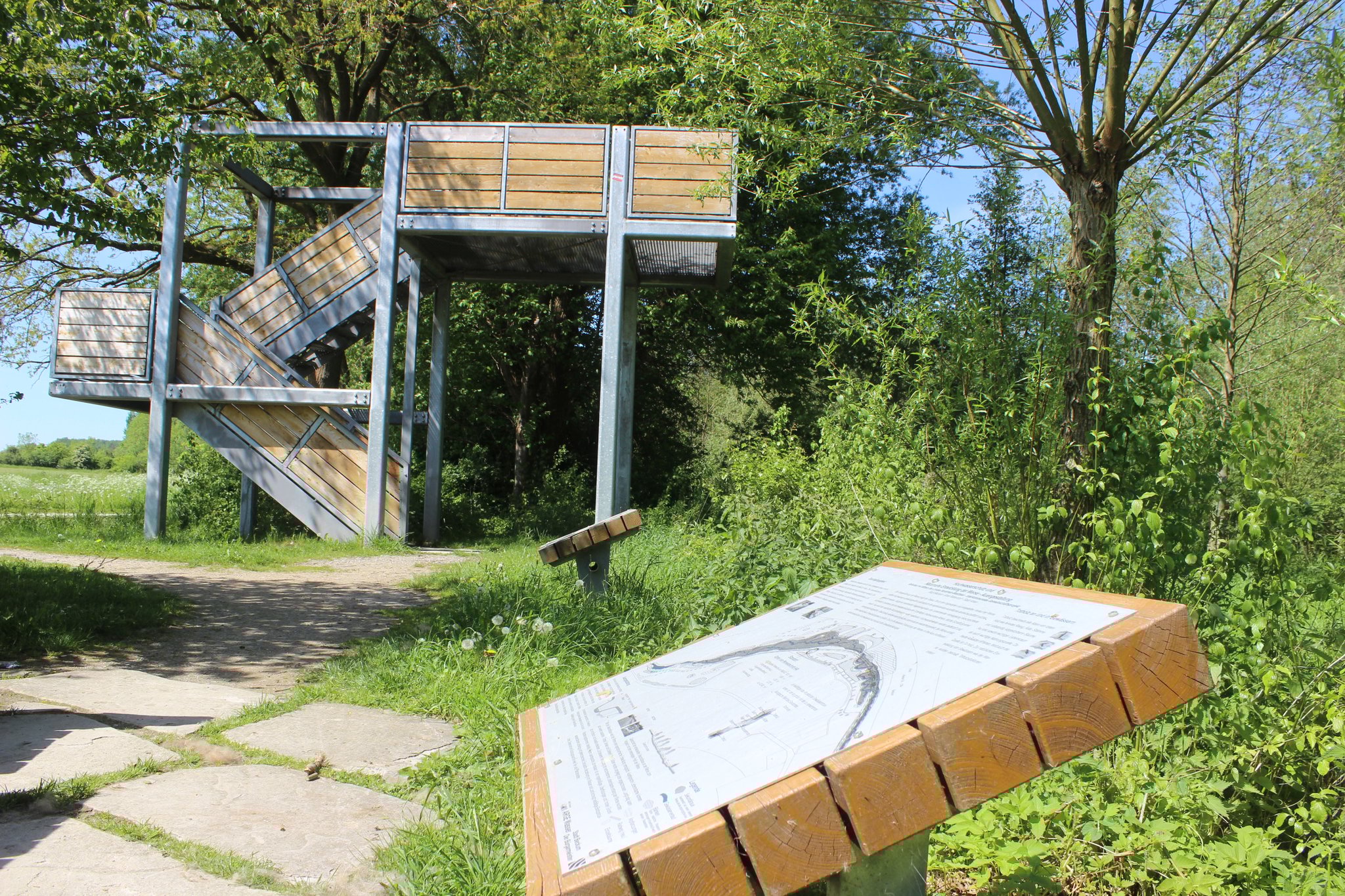 Nach ein paar Schnappschüssen nehmen wir Kurs auf Rietberg. Praktisch auf der Zielgeraden zur ehemaligen Grafschaft gehört der Blick einer prächtigen Birkenallee. Die dichte Doppelbaumreihe stehen Spalier zu einem Hingucker: der Gartenschaupark Rietberg. Auf dem drei Kilometer langen Gelände war Rietberg im Jahr 2008 für 900.000 Besucher Gastgeber der Landesgartenschau. „Träume wachsen lassen“ hieß das Motto, das aktuell nachvollzogen werden kann. Gegen ein Entgelt ist ein Teil des Gartenschaugeländes zu besuchen und zu bewundern. Zum Pflichtprogramm gehört in dem Fall, das Besteigen des aus Lärchenholz errichteten Aussichtsturms. Von oben ergibt sich ein Blick über das 40 Hektar große Gelände.