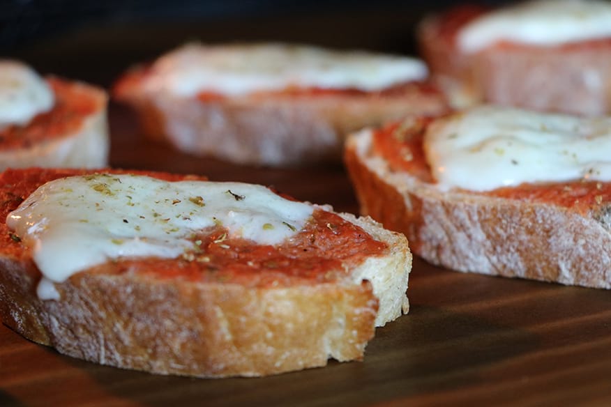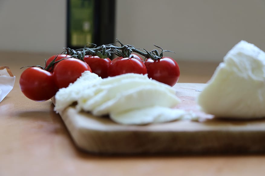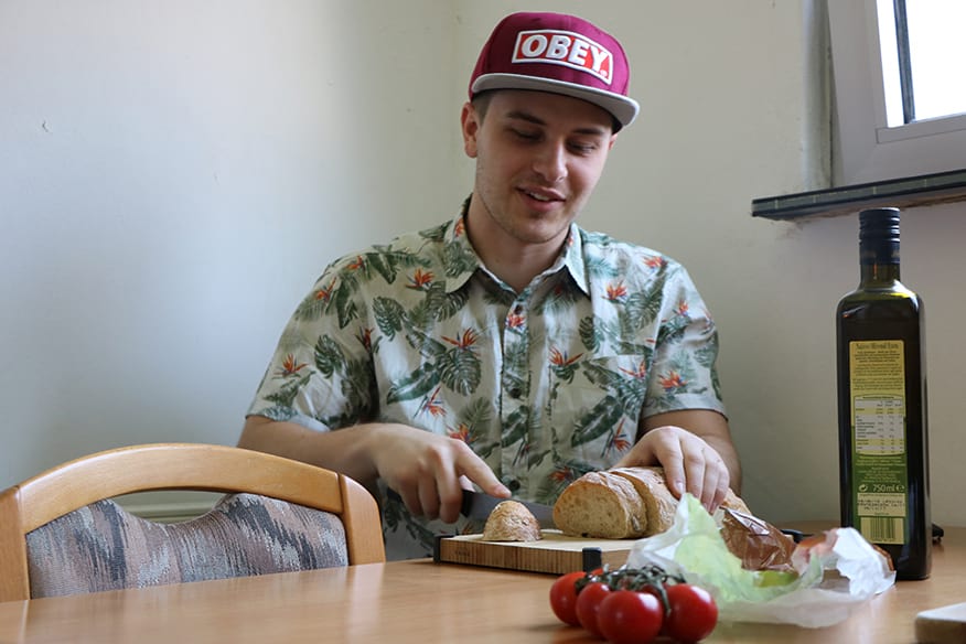 Mit drei gutgefüllten Tüten geht es zurück in die Wohngemeinschaft. Zuerst geht es an die Vorspeise. Auf das Ciabatta kommen passierte Tomaten – die haben die drei noch im Kühlschrank – sowie Gewürze und Mozzarella. Bei 180 Grad im Ofen backt das Brot vor sich hin. Fünf Minuten lassen sie das Bruschetta im Backofen. Dann holen sie es kross heraus und greifen zu. „Das schmeckt richtig gut!“, sagt Fischer. Kirchner lächelt zufrieden. „Vorspeise geglückt.“