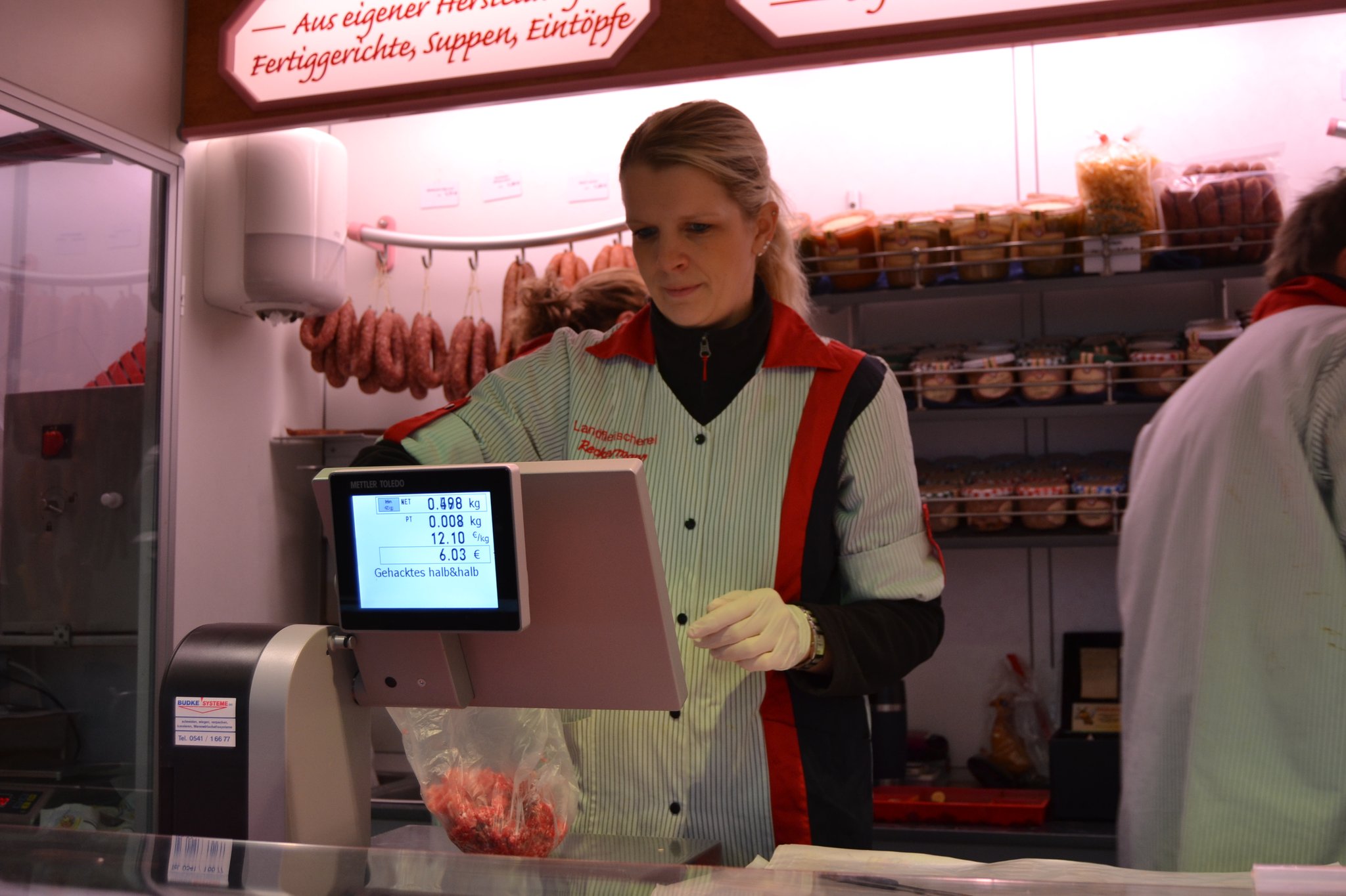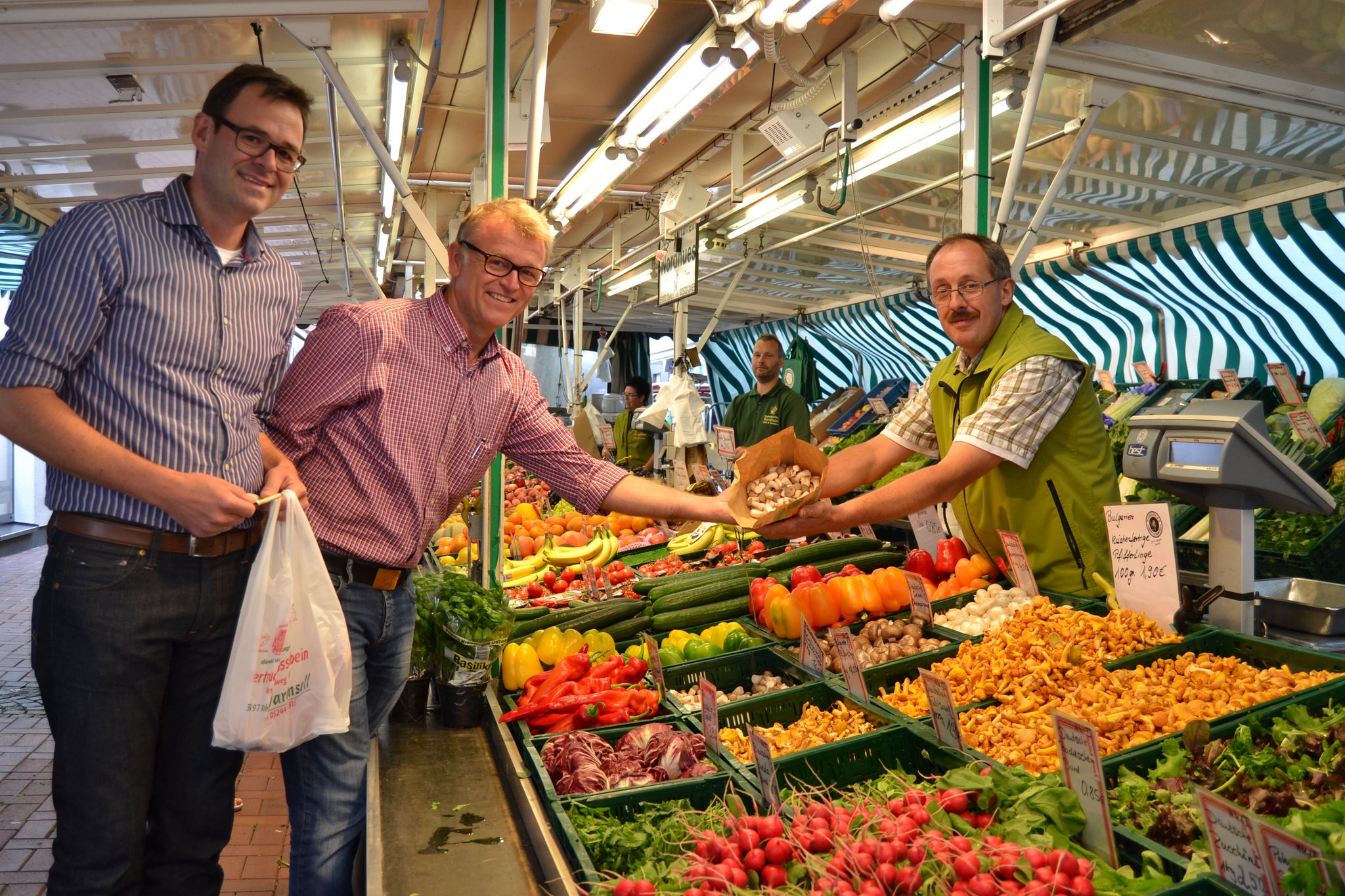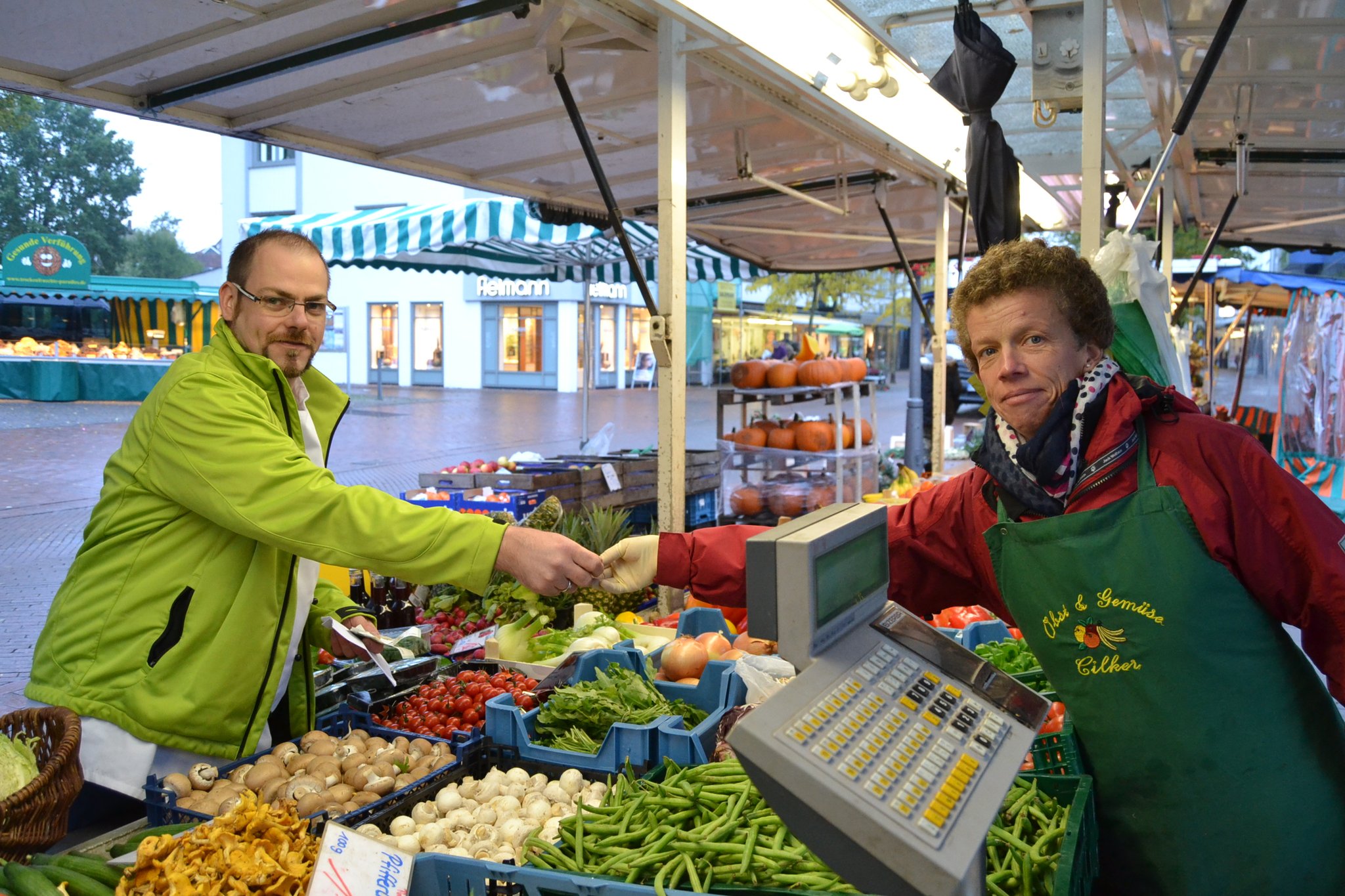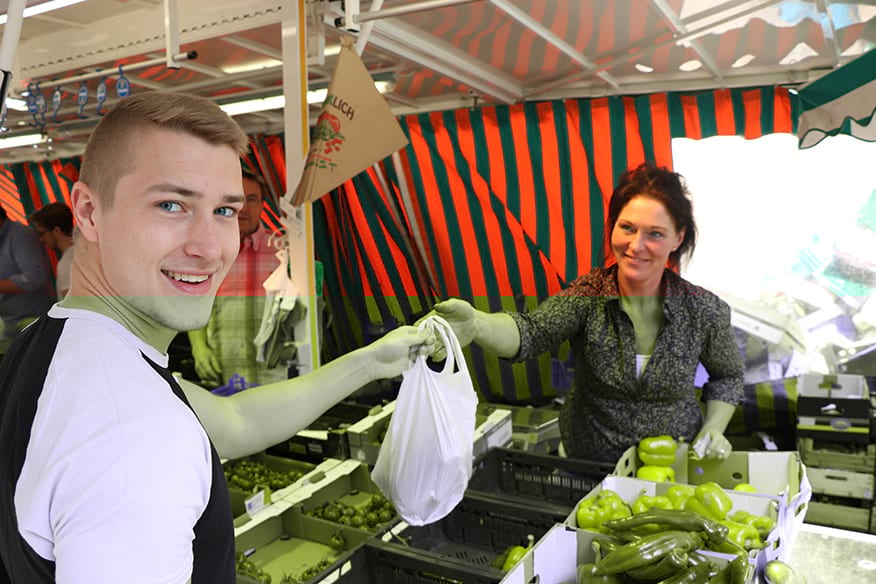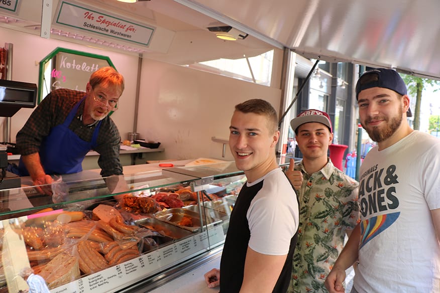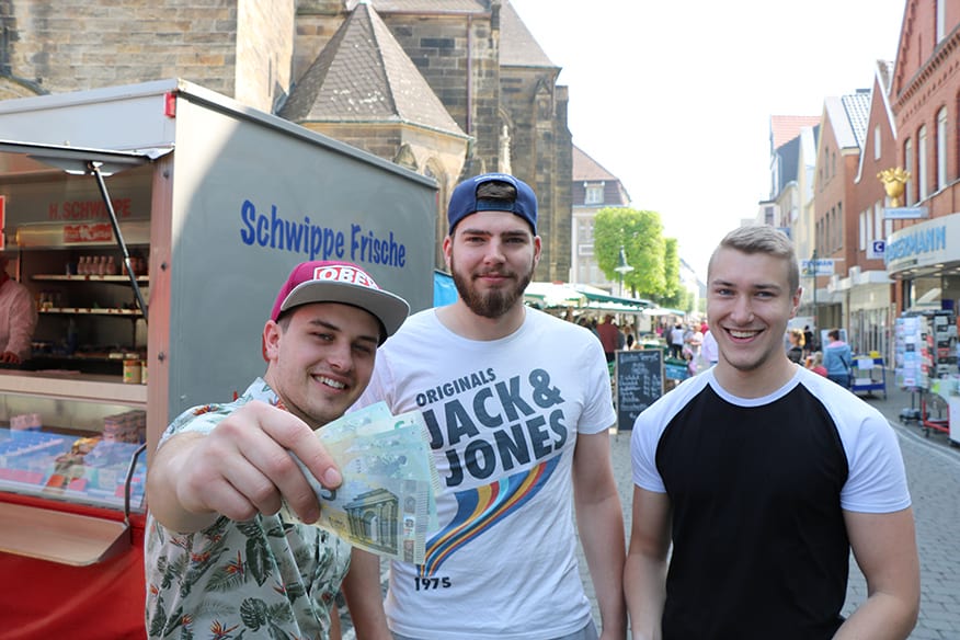 Bei Ulrike Riede bestellt Kirchner die vier roten Paprika und zusätzlich eine Zwiebel. „Das macht dann 3,60 Euro“, sagt Riede, die dem Ahlener den Einkauf in eine Tüte packt und sie ihm reicht. Als nächstes wollen die drei das Gehackte kaufen. „Halb und halb ist am besten“, meint Fischer. „Guten Tag“, grüßt er den Verkäufer an einer Fleischtheke, „bekomme ich bei ihnen Gehacktes?“ Die Antwort sitzt ein bisschen wie ein Schlag. „Nein, heute leider nicht“, antwortet der Mann. „Gibt’s doch nicht“, ärgert sich Aßmann. Das Blöde: Es ist der einzige Stand, an dem die Jungs das Fleisch hätten kaufen können. Aßmann wittert seine Chance, doch noch sein Steak zu bekommen. „Jungs, dort drüben konnte man doch Steaks holen, lasst uns da gleich noch mal gucken.“ Fischer und Kirchner stimmen zu. Nur was soll es dann als Beilage zum Steak geben? Die drei einigen sich auf eine Gemüsepfanne.