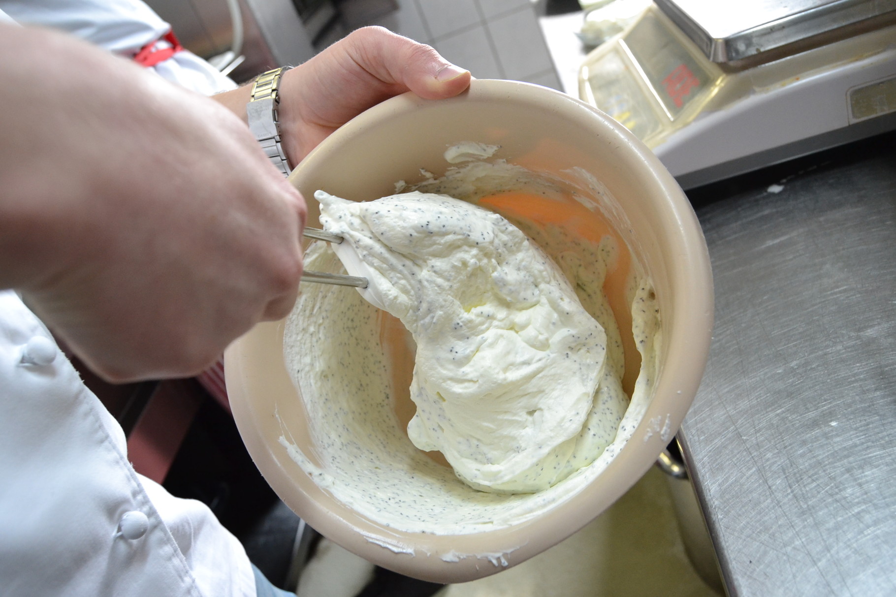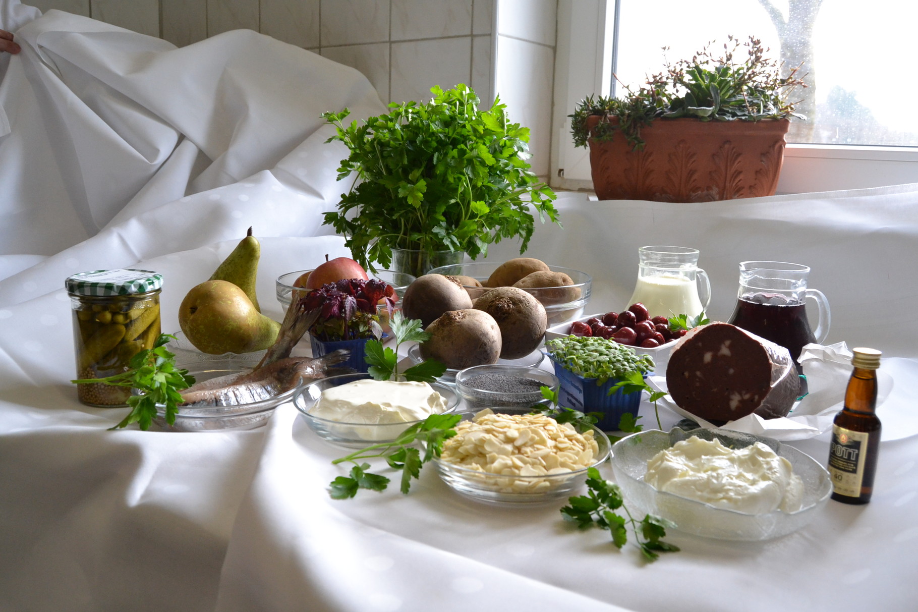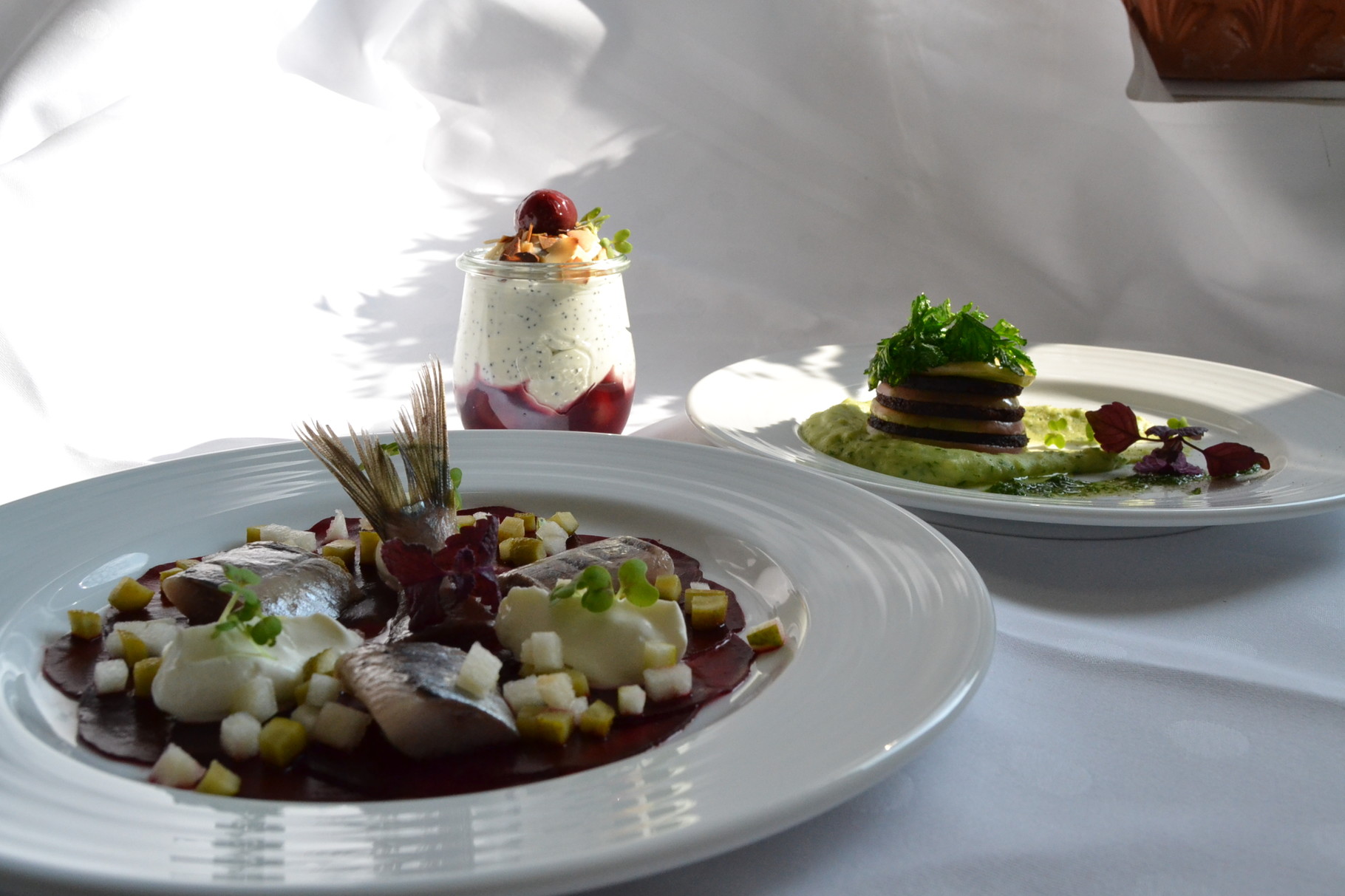 Patrick Schweigart hat sich als erster Koch der Herausforderung gestellt: „25 Euro – das ist nicht besonders viel Geld.“ Und doch hat der Koch des Hofladens Kampmann in Sünninghausen am Ende die Vorgabe eingehalten und ein Menü mit westfälischer Note angerichtet, das nicht nur optisch gelungen ist, sondern auch bestens schmeckt und zugleich satt macht: als Vorspeise Matjessalat „mal anders“, zum Hauptgang Möpkenbrot mit Apfel und Kartoffelpetersilienpüree und zum krönenden Abschluss eine feine Mohn-Mascarponecreme mit Mandeln und Rumtopf.