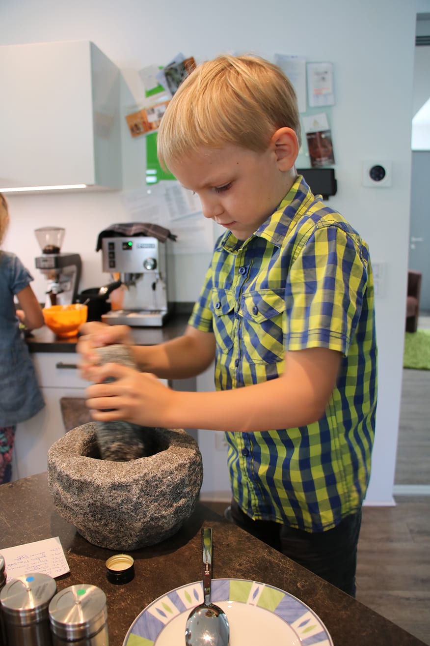 Der sechsjährige Noel schnappt sich einen Klapphocker. Den braucht er, um die Arbeitsplatte zu erreichen und seinem Großvater zu helfen. Er will nicht nur dabeistehen, wenn die Erwachsenen kochen. „Wir versuchen, Laya und Noel aktiv an gesunde Ernährung heranzuführen“, sagt Maik Große-Wietfeld. Er selbst hat das Kochen für sich entdeckt, als die Kinder geboren wurden.