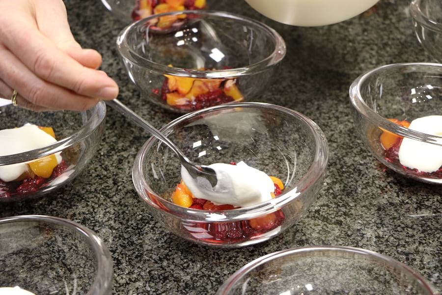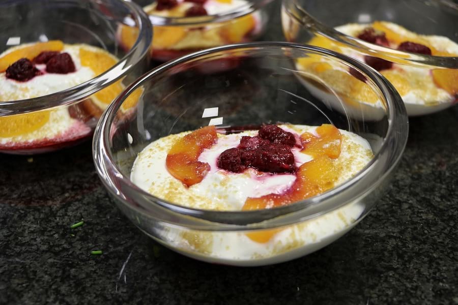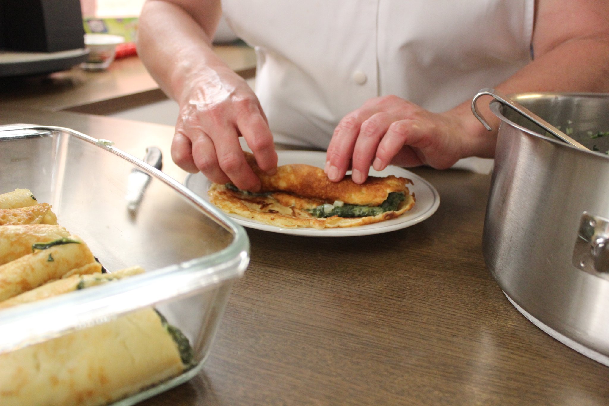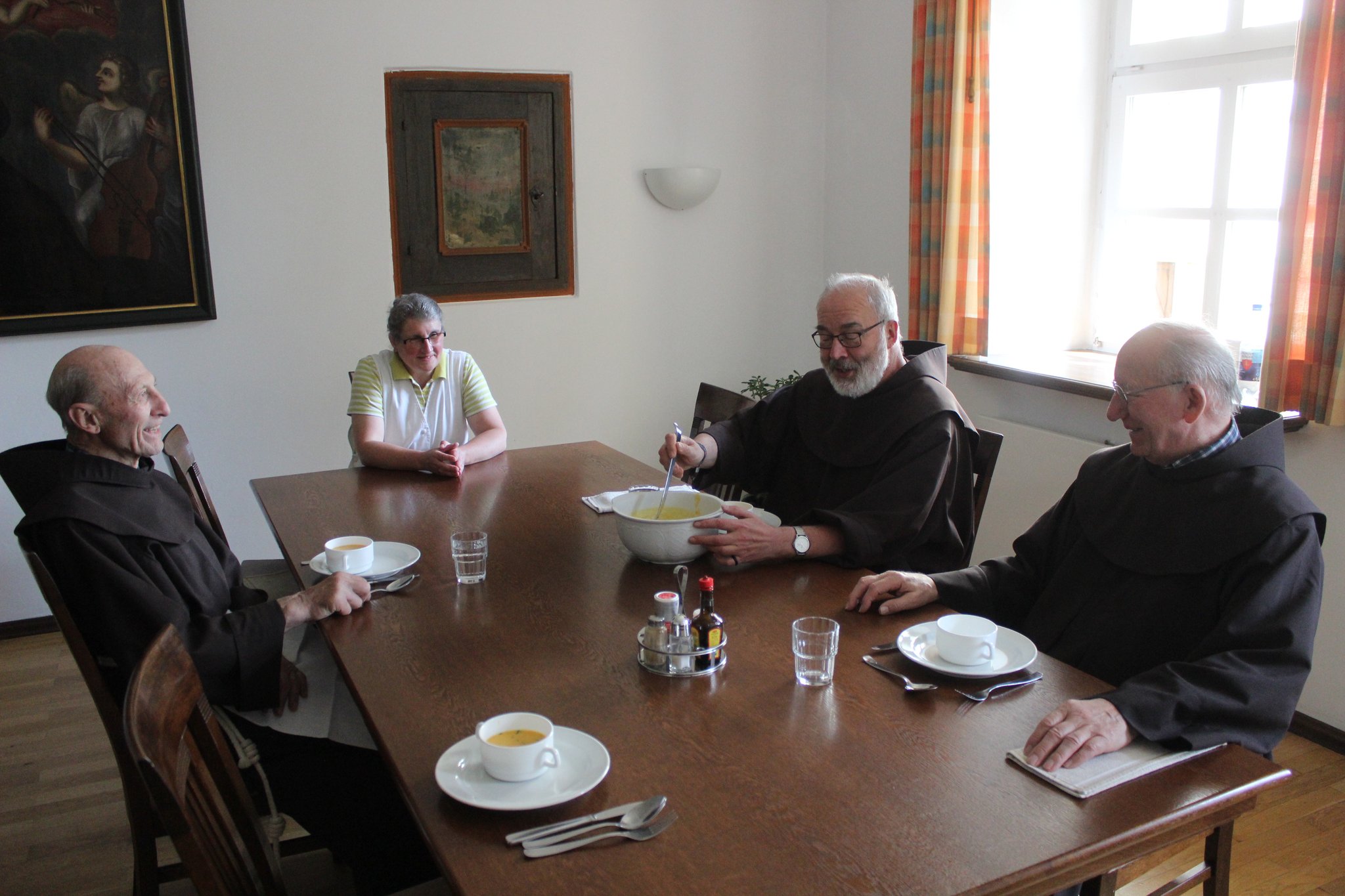 In der Küche des Klosters zauberte sie raffinierte Speisen, die sich zu einem schmackhaften Menü zusammenstellen lassen. Den Brüdern serviert sie eine Möhrensuppe als Vorspeise. Für den Hauptgang hat sie sich für einen Pfannkuchen gefüllt mit Spinat entschieden. Angerichtet wurden diese mit einem bunten Salat und einem Essig-Öl-Dressing. Zum Abschluss gibt es den „Himbeertraum“, basierend auf Magerquark, Sahne, geraspelten Schokoküssen und verziert mit frischen Himbeeren.