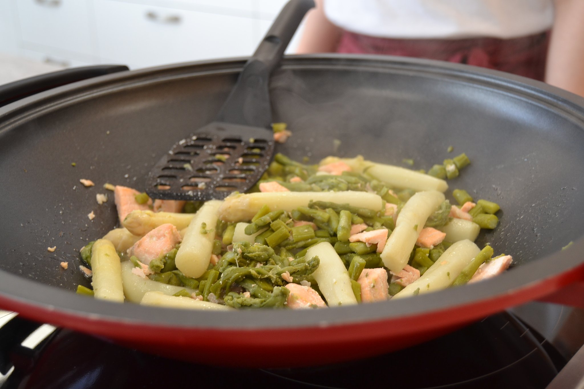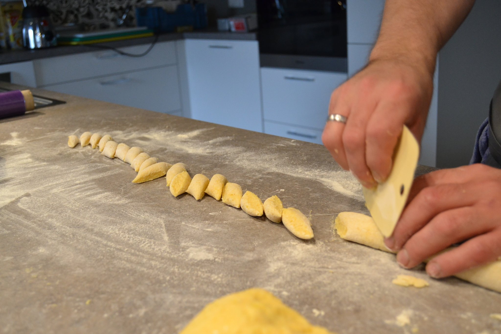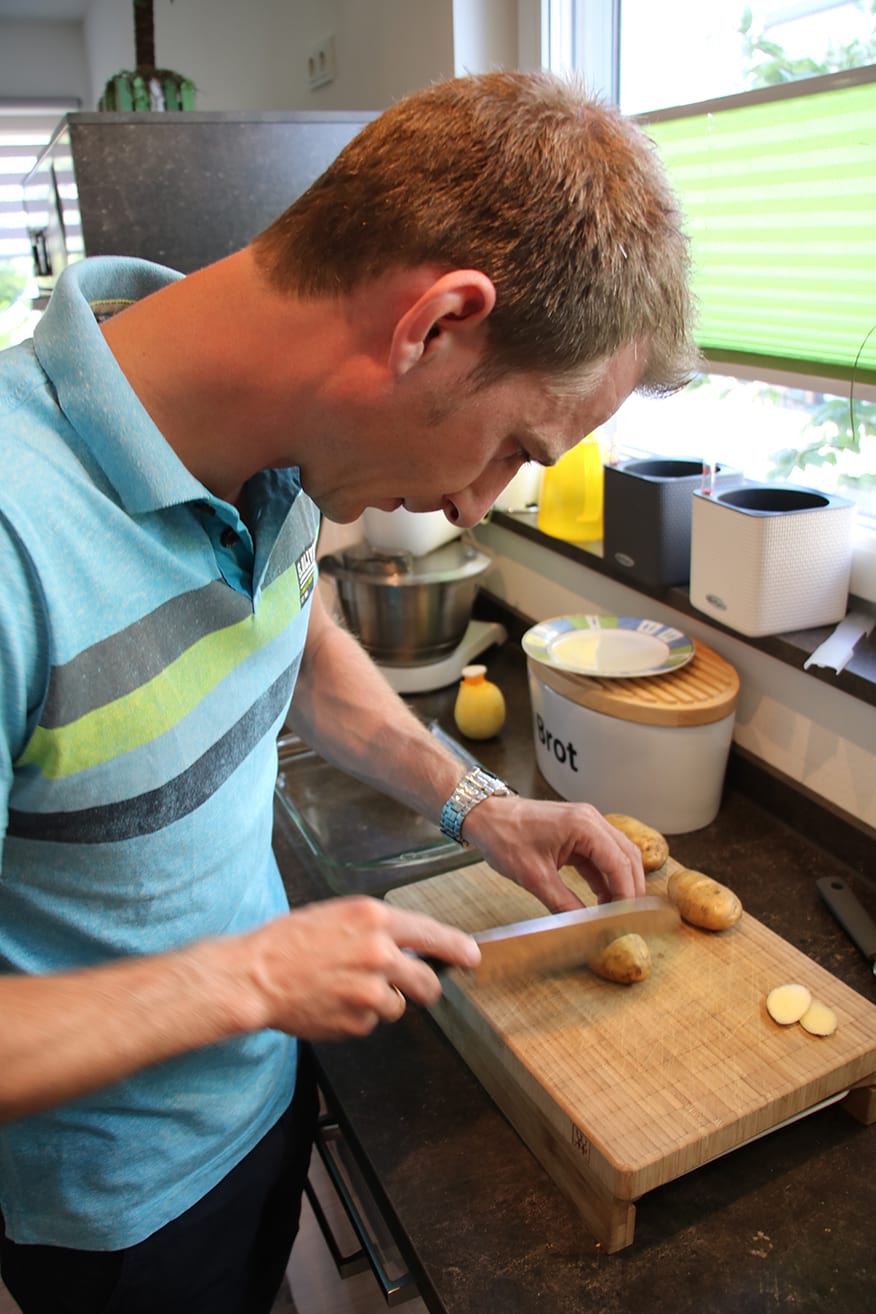Zurück im Rheda-Wiedenbrücker Stadtteil Batenhorst. Die Familie ist zuhause angekommen und schwärmt aus – Stephanie und Maik Große-Wietfeld bringen die Einkäufe in die Küche, die Kinder laufen schnell ins Badezimmer, um ihre Hände zu waschen. Sofort werden einige Regler betätigt, der Ofen vorgeheizt, die Pfannen auf den Herd gestellt. Willi Korte macht sich daran, seinen Teil des Drei-Gänge-Menüs vorzubereiten: Kräuter-Aal mit Schwarzbrot und Ricotta.