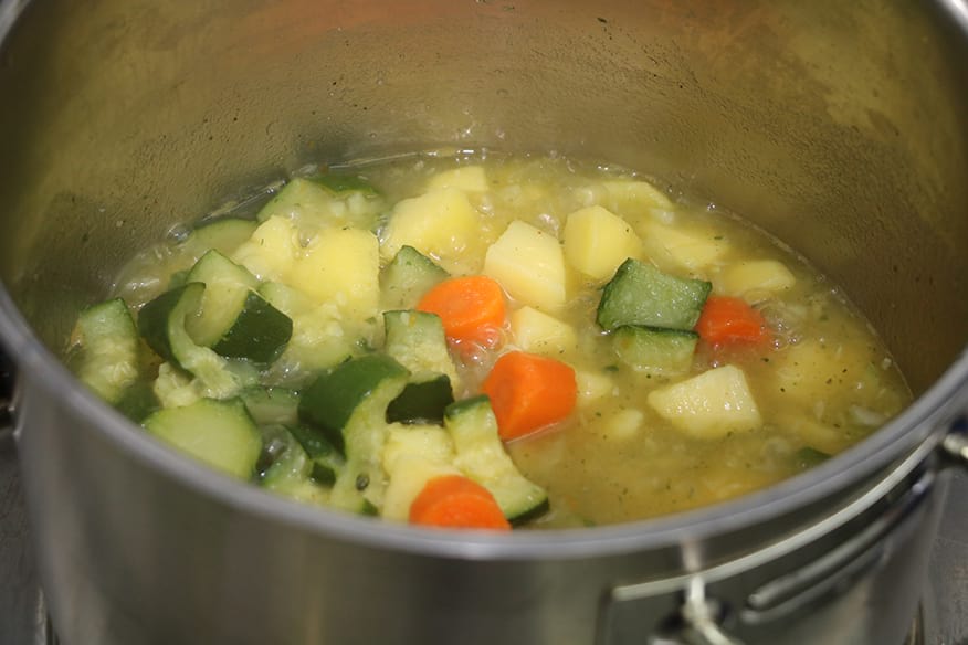 Zurück in der Küche: Ulli Broer löscht Kartoffeln und die übrigen Zutaten mit einem Liter Gemüsebrühe und 350 Milliliter Apfelsaft ab. Danach heißt es erst einmal warten: das Gemüse muss 20 Minuten köcheln. Genug Zeit also für einen Plausch mit dem Kochpartner. Oder besser gesagt für einen weiteren. Denn während die Männer am Herd stehen, wird geredet, gelacht und rumgealbert. „Die Abende gehören mit zu den schönsten im Jahr“, betont Olaf Bücker. Die 20 Minuten sind rum. Ulli Broer schaut erwartungsvoll in den Topf. „Sieht gut aus.“ Beim Pürieren entsteht nach und nach die gewünschte sämige Konsistenz. Es folgt der erste Geschmacktstest: „Mmmh. Das ist richtig gut“, schießt es aus ihm heraus.