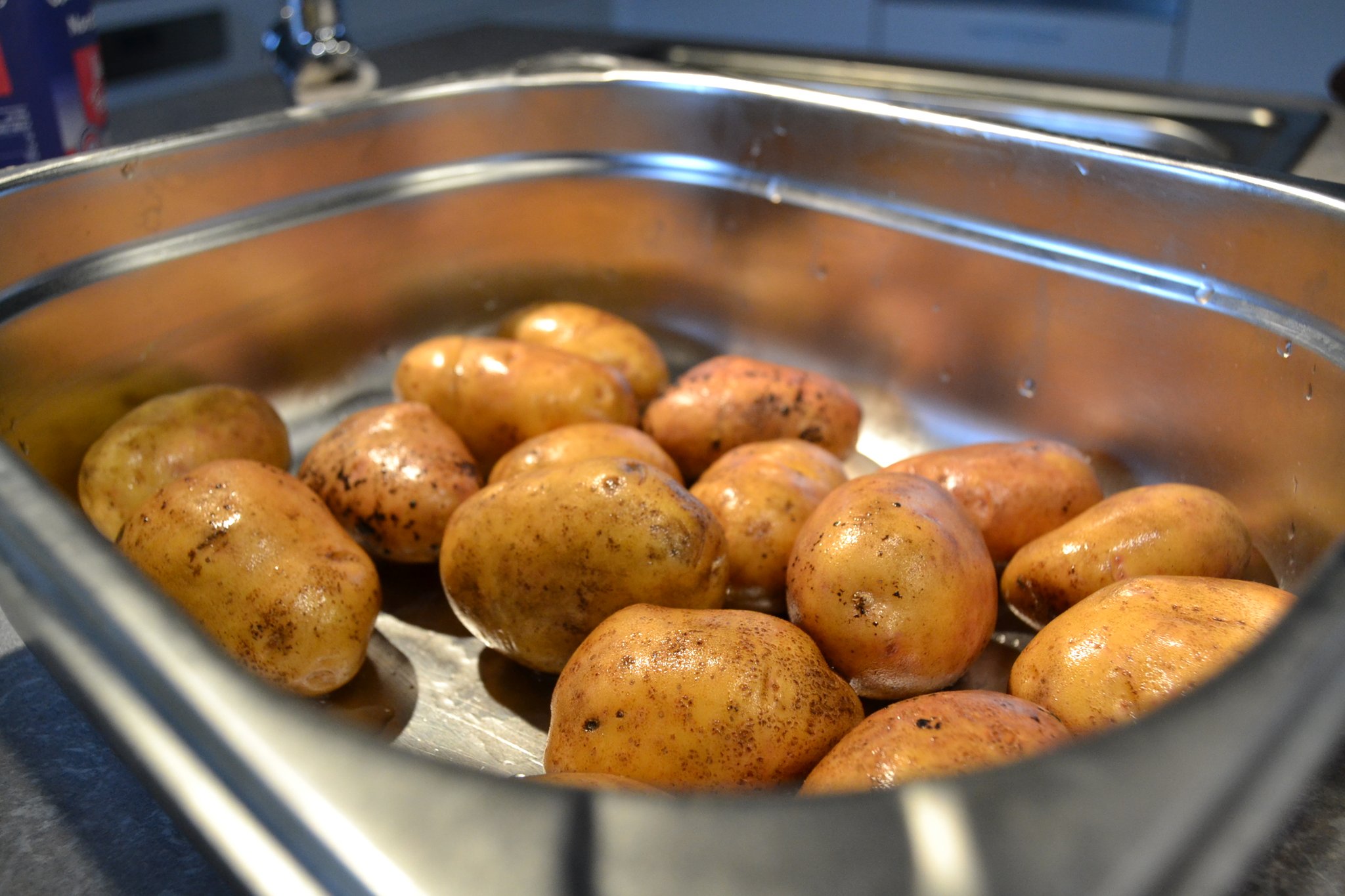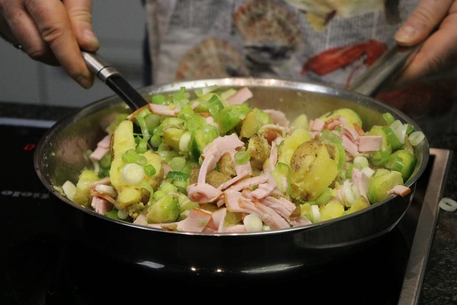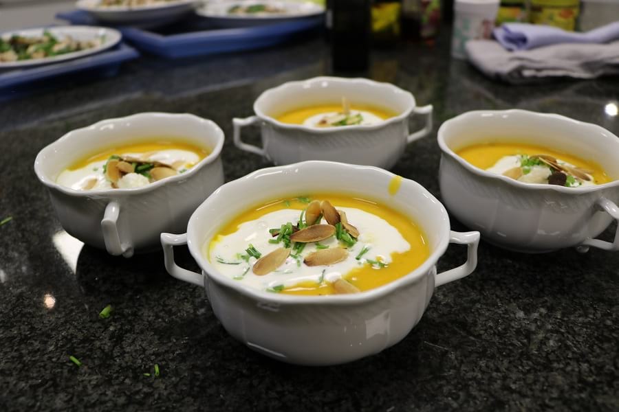 Was auf den Tisch kommt, hat sich aber wie gewohnt die Ernährungsberaterin überlegt. Als Vorspeise gibt es eine Möhrensuppe mit Süßkartoffeln, als Hauptgang eine Kartoffelpfanne mit Rosenkohl und Kassler sowie als Nachspeise einen Himbeer-Traum.