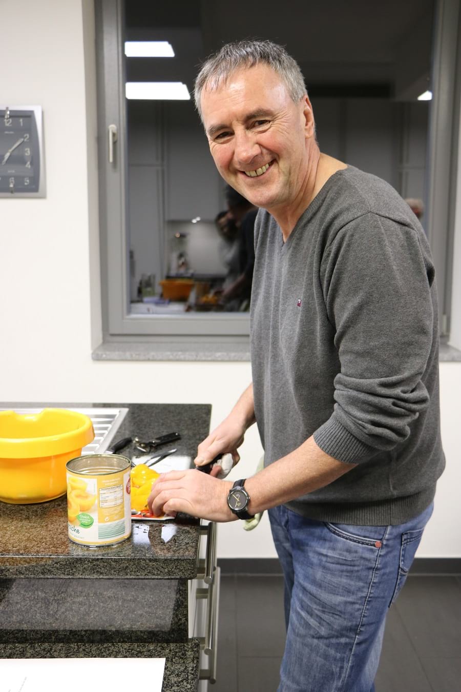 in Stückchen und gibt die Teigkrümel darüber. Dann kommen die Gläser in den Backofen. Es klingelt. Vor der Tür stehen Kassierer Bernd Mußenbrock und Monika Hovell, ehrenamtliche Mitarbeiterin.