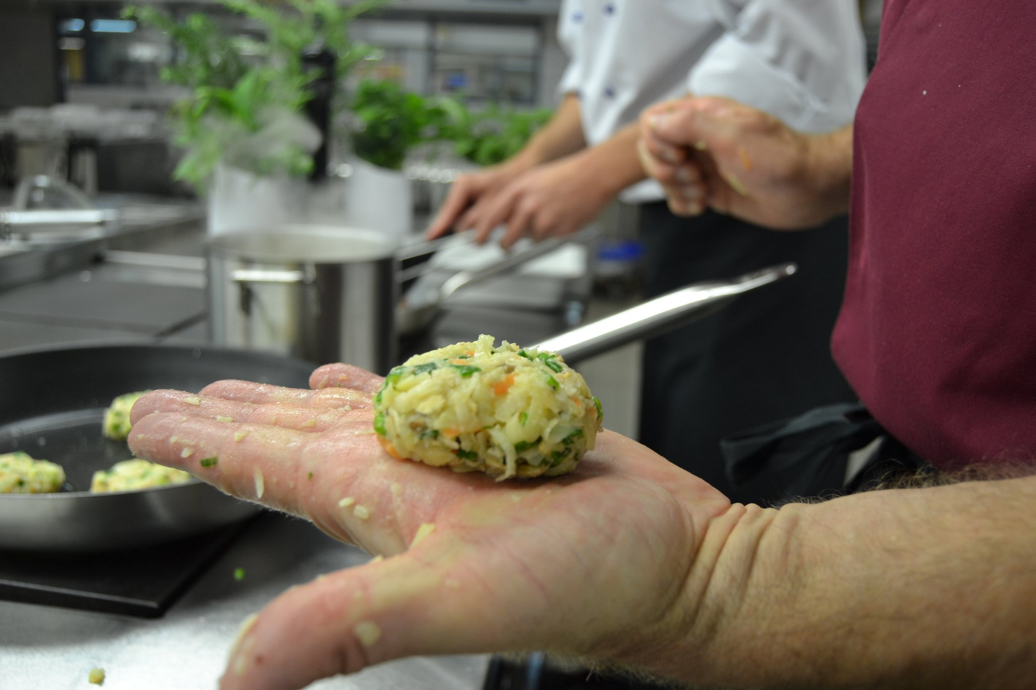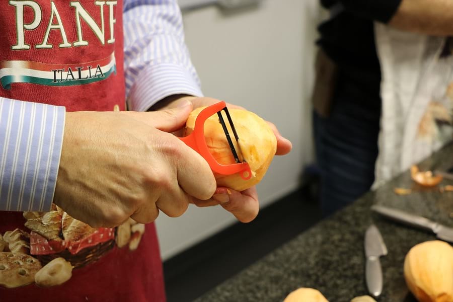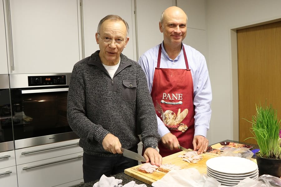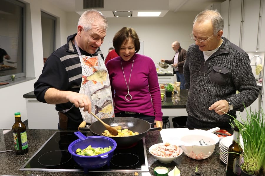 Am Montagabend kann es dann losgehen: In der Küche der Familienbildungsstätte steht alles für das Menü bereit. In gewohnter Manier legen die Kochclub-Mitglieder ihre Schürzen an, bilden Teams und lesen sich in die Rezepte ein. „Das einzige, womit wir kämpfen müssen, sind die stumpfen Messer“, scherzt Ulli Broer, als er die Süßkartoffeln für die Suppe schneidet. Er zerkleinert danach auch die Möhren, Zwiebeln und den Ingwer. Zeitgleich putzt und halbiert Rudolf Knobloch den Rosenkohl für die Kartoffelpfanne. Wolfgang Barth – intern auch Nachtischexperte genannt – macht sich an den Himbeer-Traum.