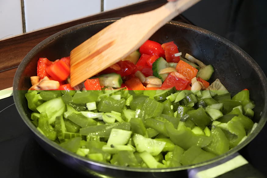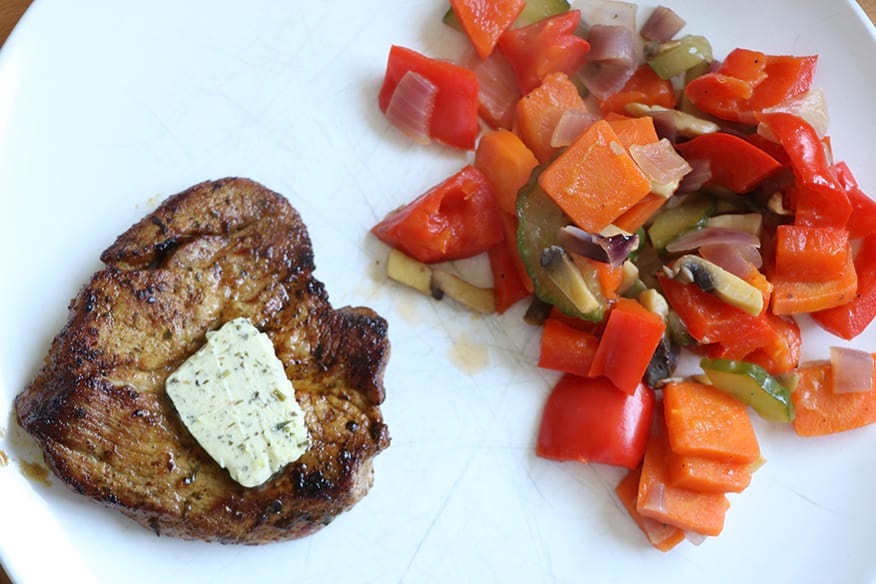 Es geht an die Hauptspeise: Steak mit Gemüsepfanne. Nach und nach kommen geschnittene Möhren, Champignons, Tomaten, Gurkenscheiben, Zwiebeln und Paprika in die Pfanne. Während das Gemüse gart, legt Kirchner die Nacken-Steaks in die Pfanne. Von beiden Seiten lässt er sie zwei Minuten braten, dann kommen sie für fünf Minuten in den Ofen. In der Zwischenzeit ist auch das Gemüse gar. Jetzt geht es ans Anrichten. Aßmann holt aus dem Kühlschrank ein wenig Kräuterbutter für das Steak. „Das Fleisch sieht klasse aus“, sagt Fischer, der sich das Messer und die Gabel schnappt und sich ein Stück Steak abschneidet, in den Mund schiebt, kaut und sagt: „Das ist echt lecker geworden.“ Die Gemüsepfanne ist eine willkommene Beilage zum Fleisch. Ein leckeres Essen mit wenig Aufwand.