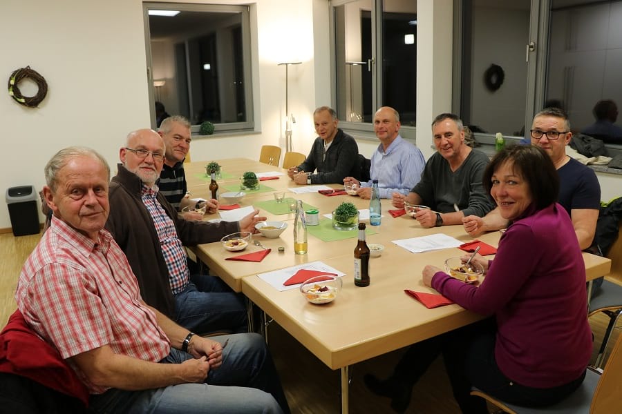 Nach eineinhalb Stunden in der Küche sind alle drei Gerichte soweit. Die Vorspeise kann serviert werden. Mit einer Kelle schöpft Olaf Bücker die Suppe aus dem Topf in die einzelnen Schälchen. Garniert wird das Ganze mit Schnittlauch, etwas Sahne und Mandelblättchen. Ulli Broer ist nach dem ersten Löffel nach wie vor von seiner Suppe begeistert. Und auch die anderen sind sich einig: Lecker. Es folgt die Hauptspeise: Kartoffelpfanne mit Rosenkohl und Kassler. Auch hier macht sich nach dem ersten Bissen zunächst wieder andächtige Stille breit – ein gutes Zeichen, wie die Männer wissen. Nach den deftigen Speisen freuen sich die Hobby-Köche nun auf den Nachtisch. „Nicht zu süß“, erklingt es aus der Runde. Gemeinschaftliches Nicken. Mit dem Ergebnis ihres Drei-Gänge-Menüs sind alle sehr zufrieden.
