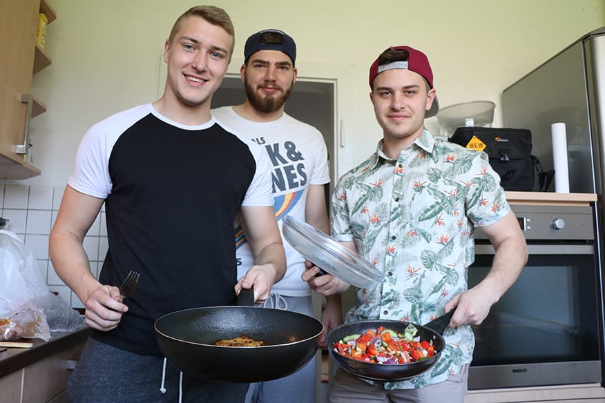 Samstag, 12 Uhr, Mittagszeit. Julius Kirchner, Bjarne Aßmann und Lukas Fischer kochen sich ihr Mittagessen an diesem Tag selbst. „Klingt irgendwie komisch“, sagt Fischer. Denn bis dato blieb die Herdplatte der Dreier-Wohngemeinschaft meistens kalt. „Ich kläre die Finanzen“, sagt Aßmann, der sich die fünf Fünf-Euro-Geldscheine schnappt und ins Portemonnaie legt.