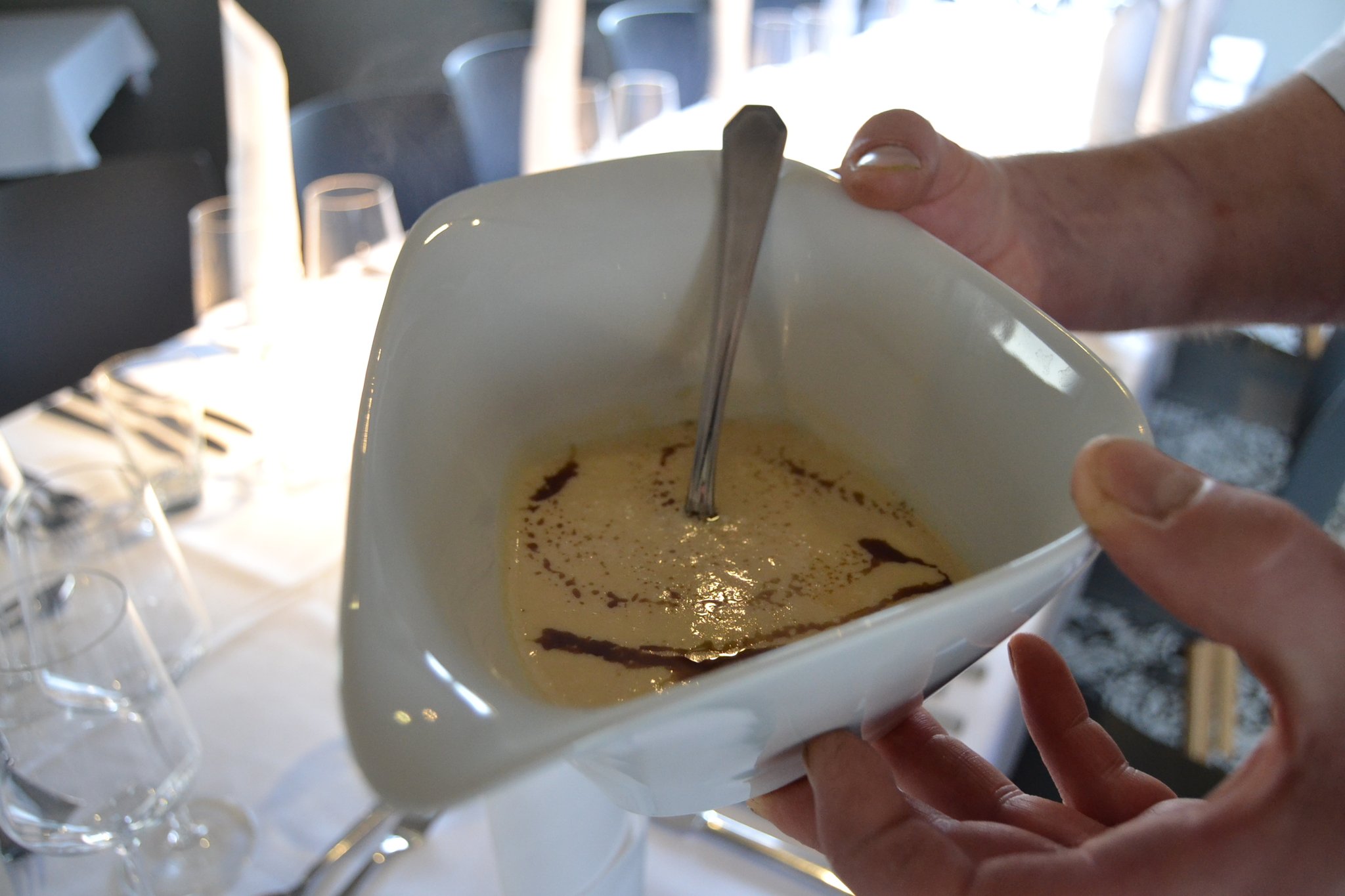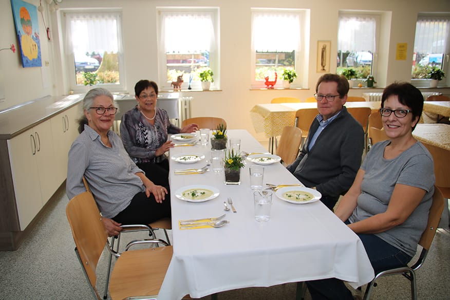 Esstisch Platz genommen haben und zunächst die Vorspeise verzehren. Das Fazit? „Lecker, eine tolle Suppe“, sagt Mußenbrock. Die Kollegen nicken, geben ihr Kompliment an die Köchin. Auch der