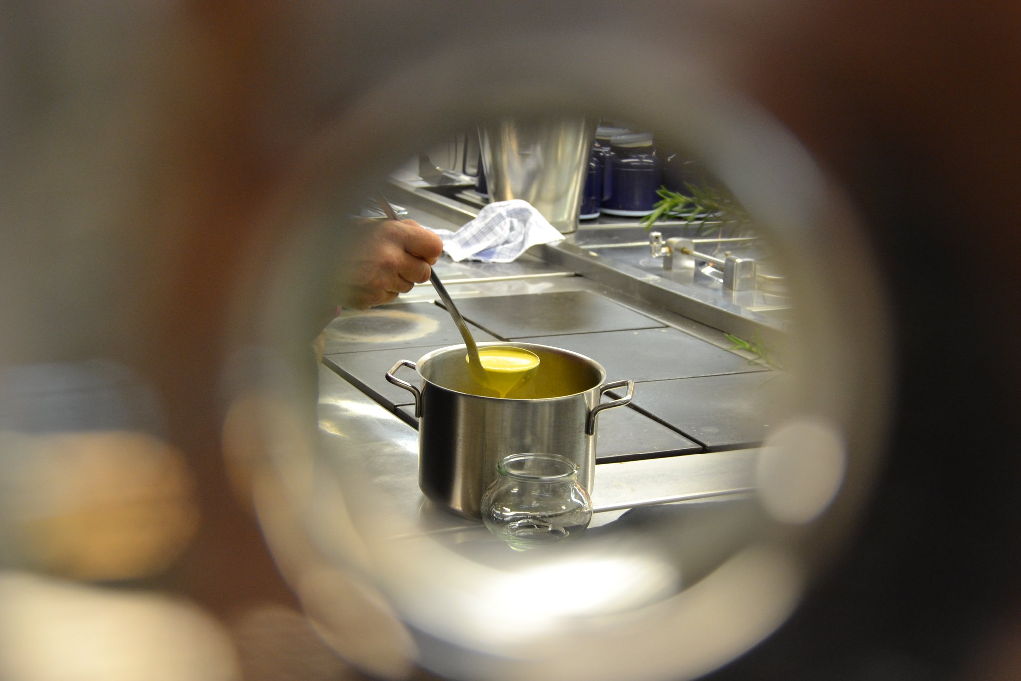 An normalen Arbeitstagen hat Haag etwa zwölf Mitarbeiter an ihrer Seite Für die kleine Runde heute steht sie alleine am Herd. „Kein Problem“, sagt sie, als sie Wasser für die Zucchini-Cremesuppe aufsetzt. Sie hat sich genau überlegt, was wann passieren muss, damit keiner ihrer bald eintreffenden Gäste auf keinen Gang warten muss.