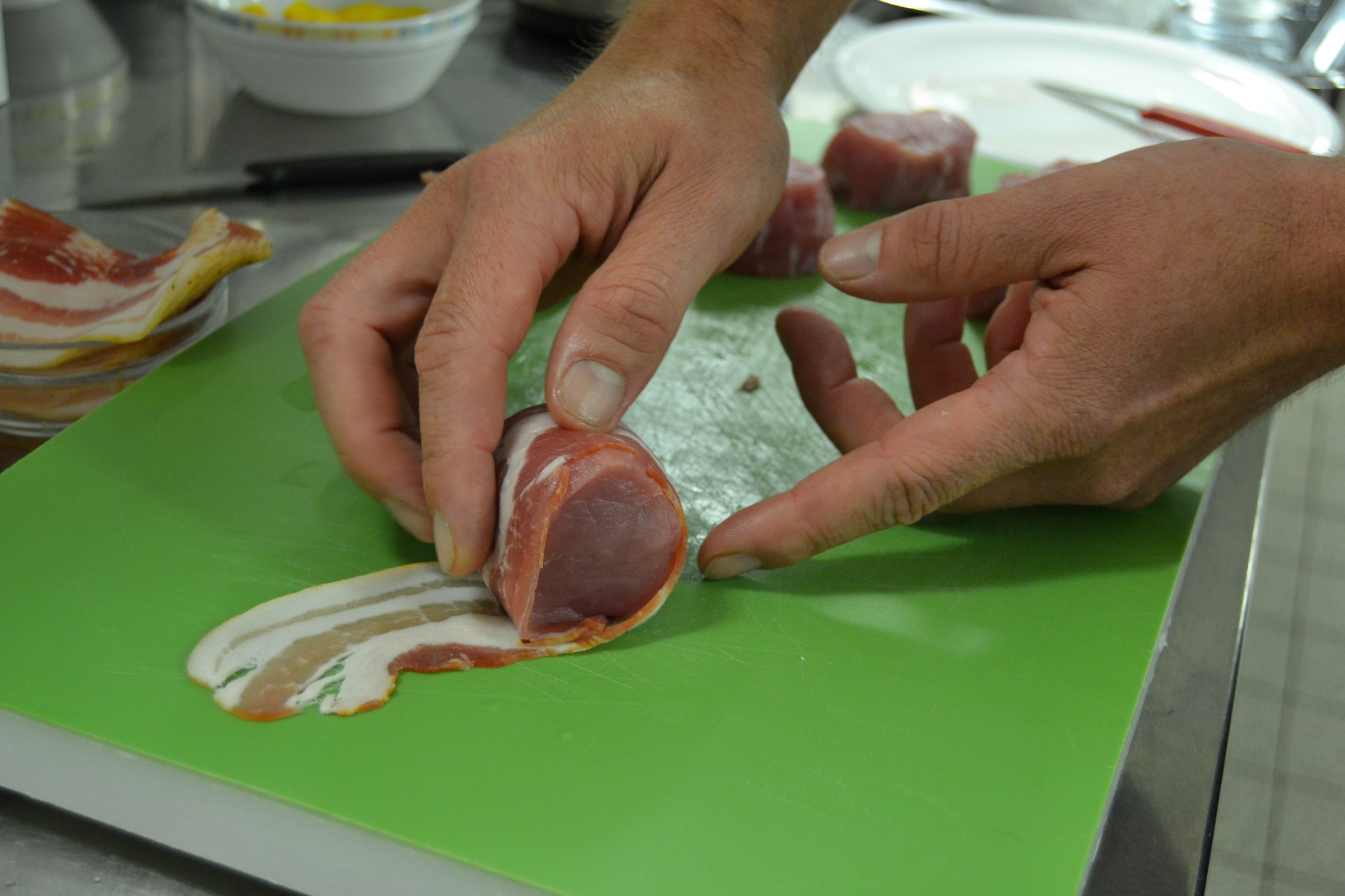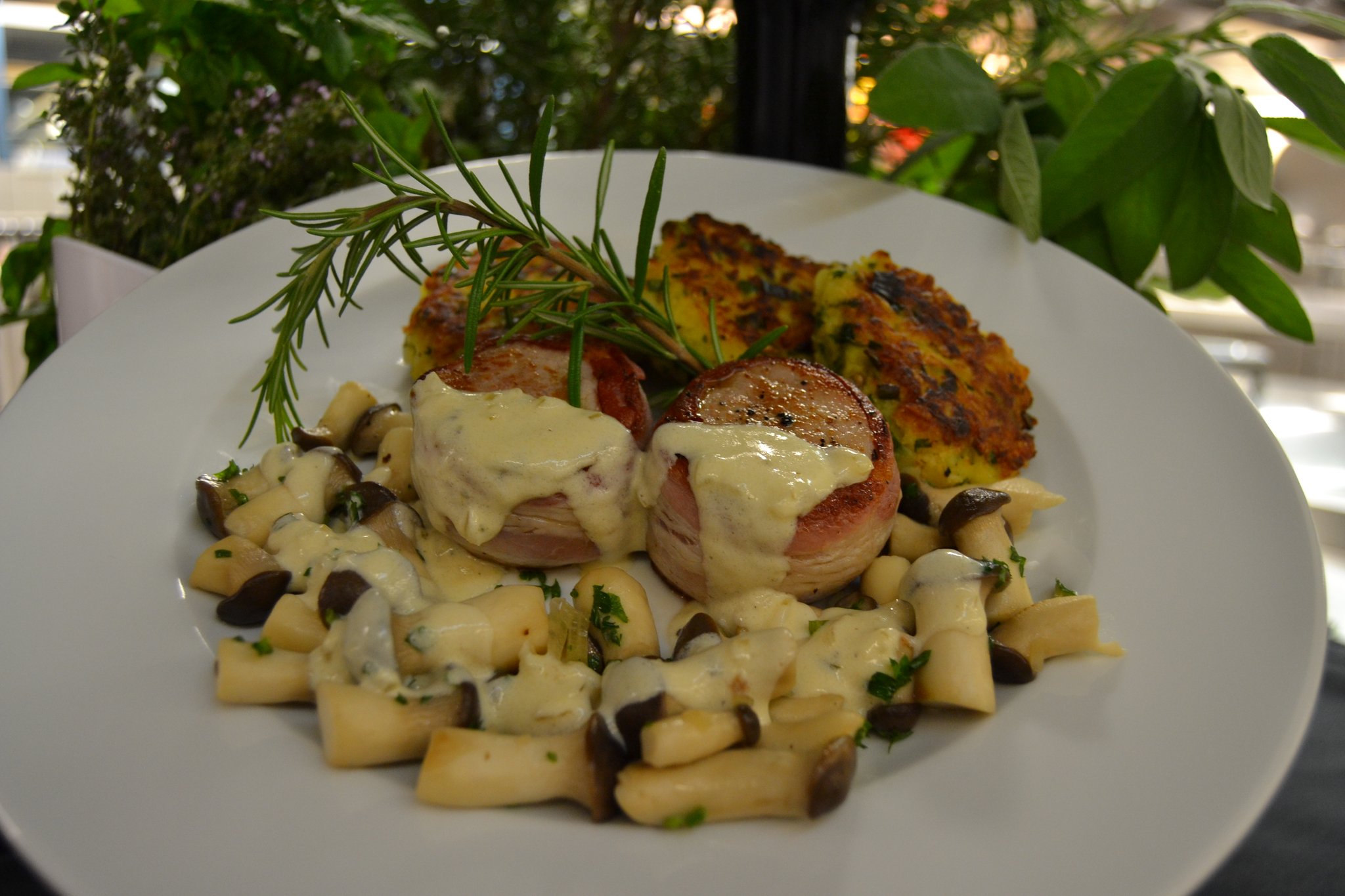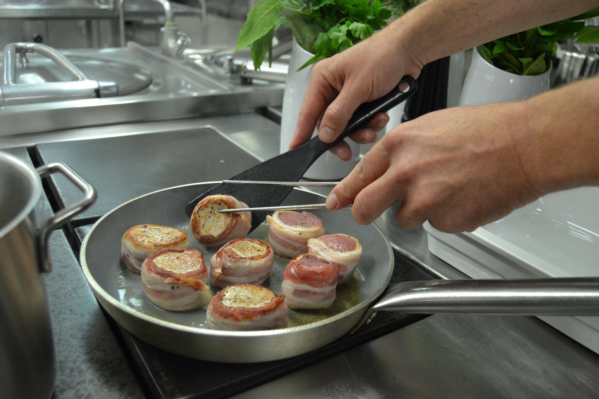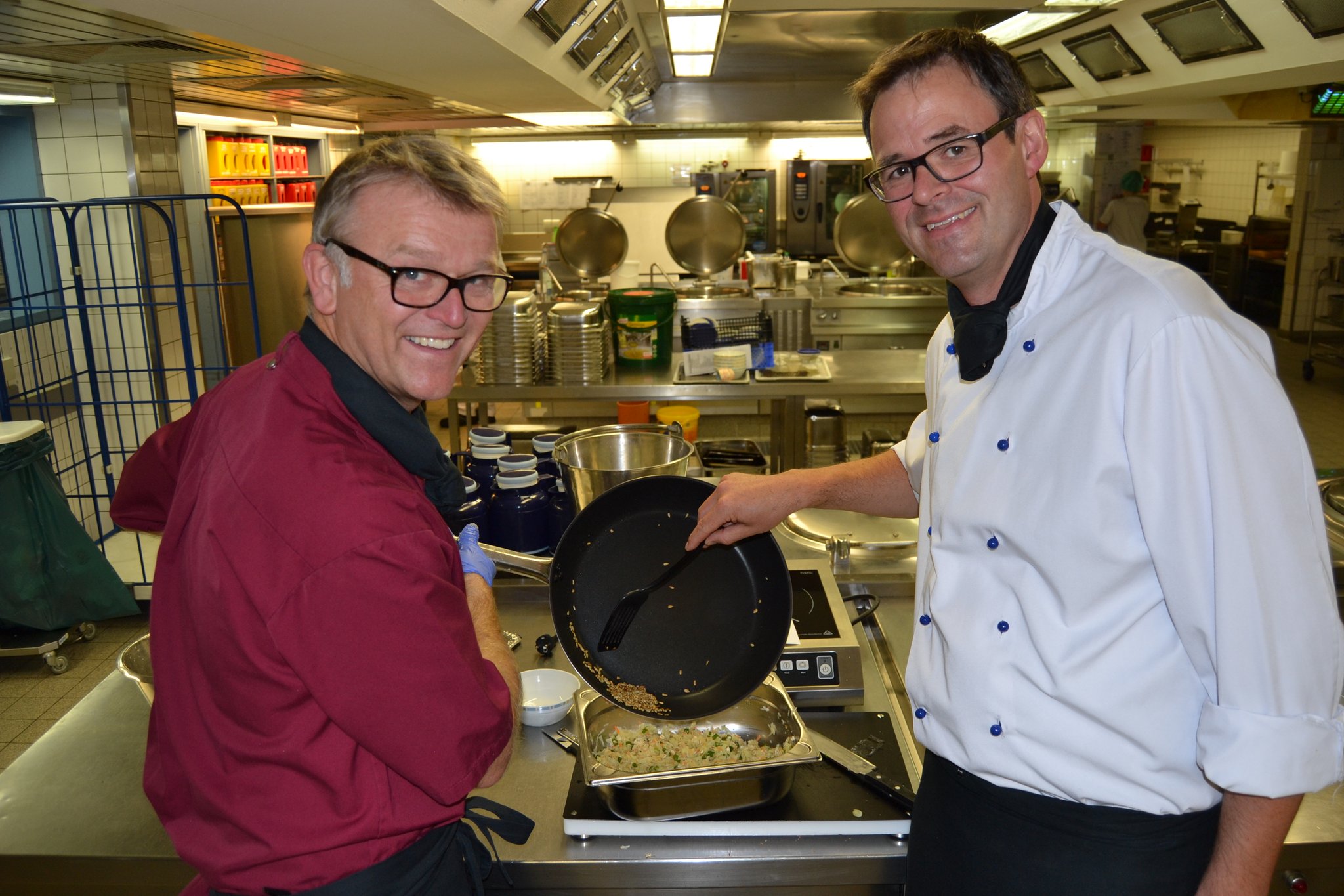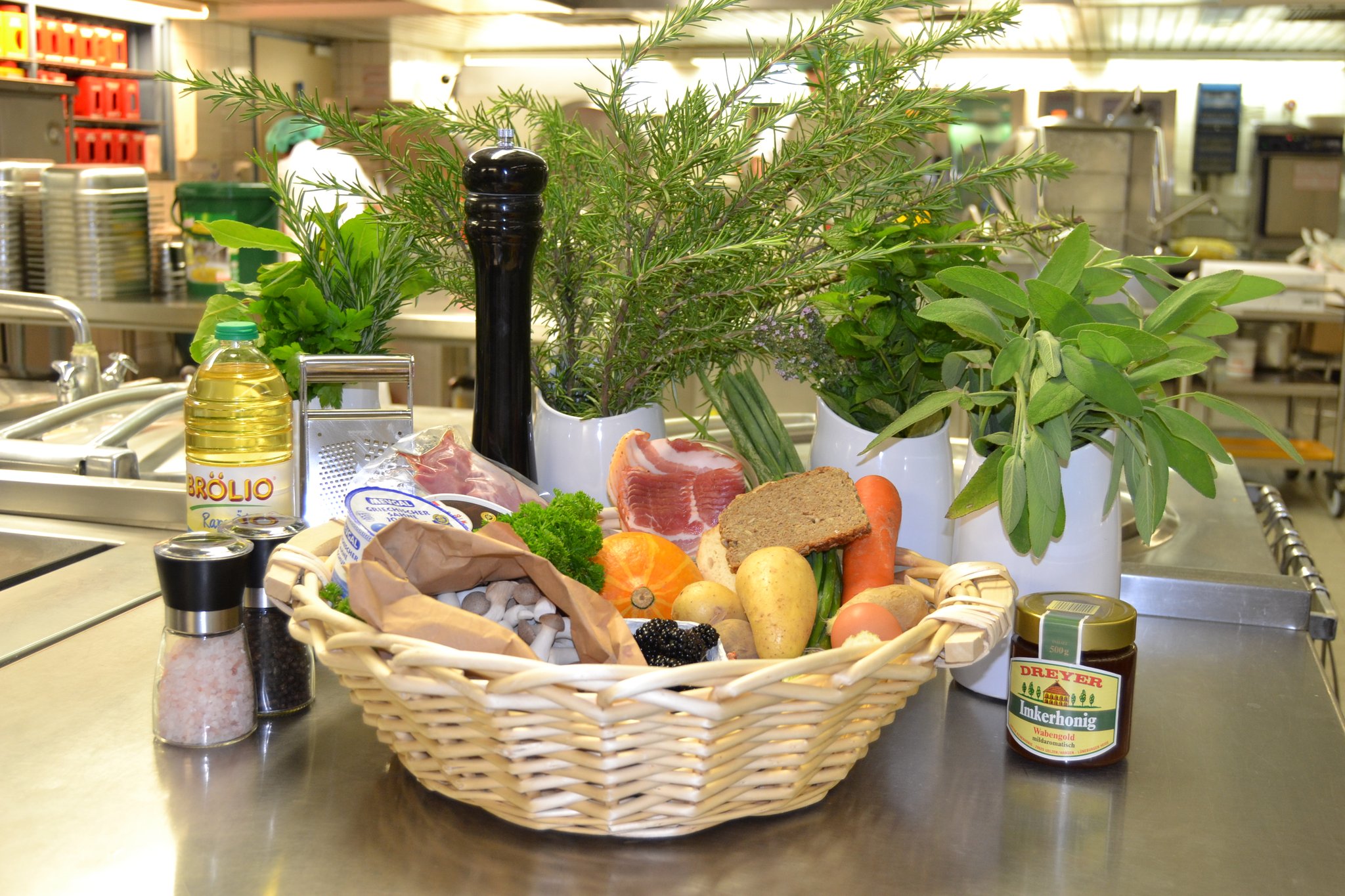 Passend zum Start der kühlen Jahreszeit haben sich die beiden Männer eine deftige Menüabfolge ausgedacht. Sie servieren eine cremige Kürbiscremesuppe mit Croutons sowie als Hauptspeise Schweinemedaillons im Speckmantel mit Gemüse-Kartoffel-Rösti und Kräuterseitlingen in einer Riesling-Rahmsoße. Den süßen Abschluss bildet eine Mascarpone-Vanillecreme mit frischen Brombeeren.