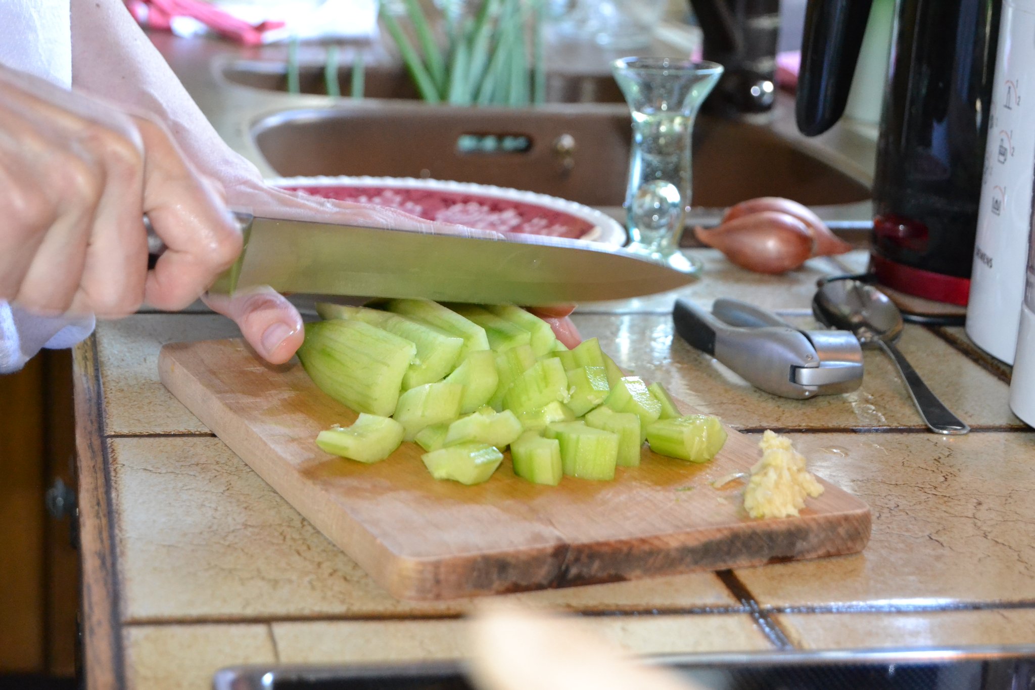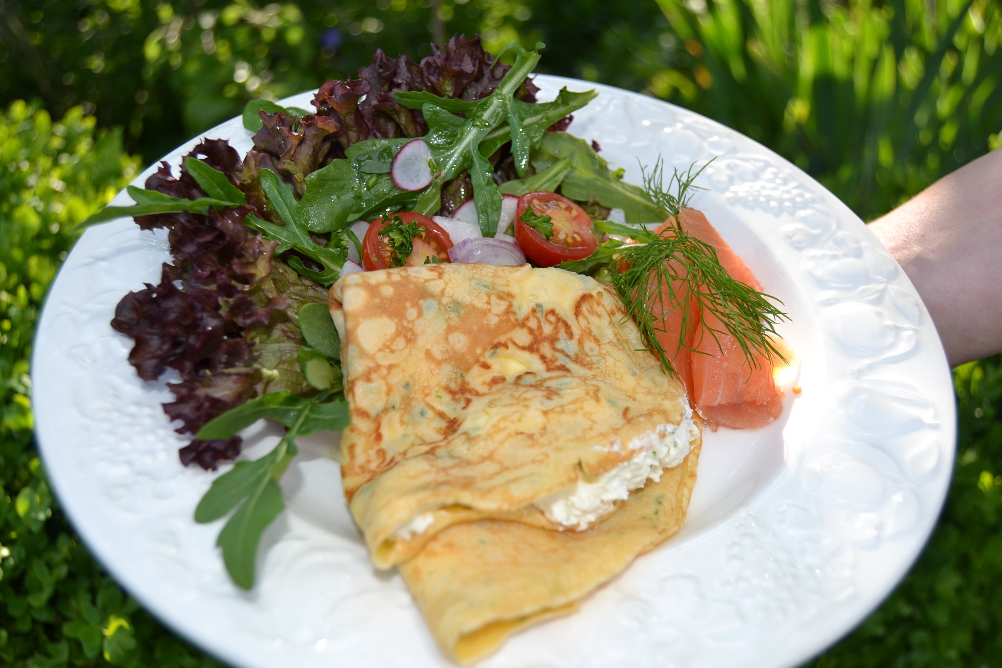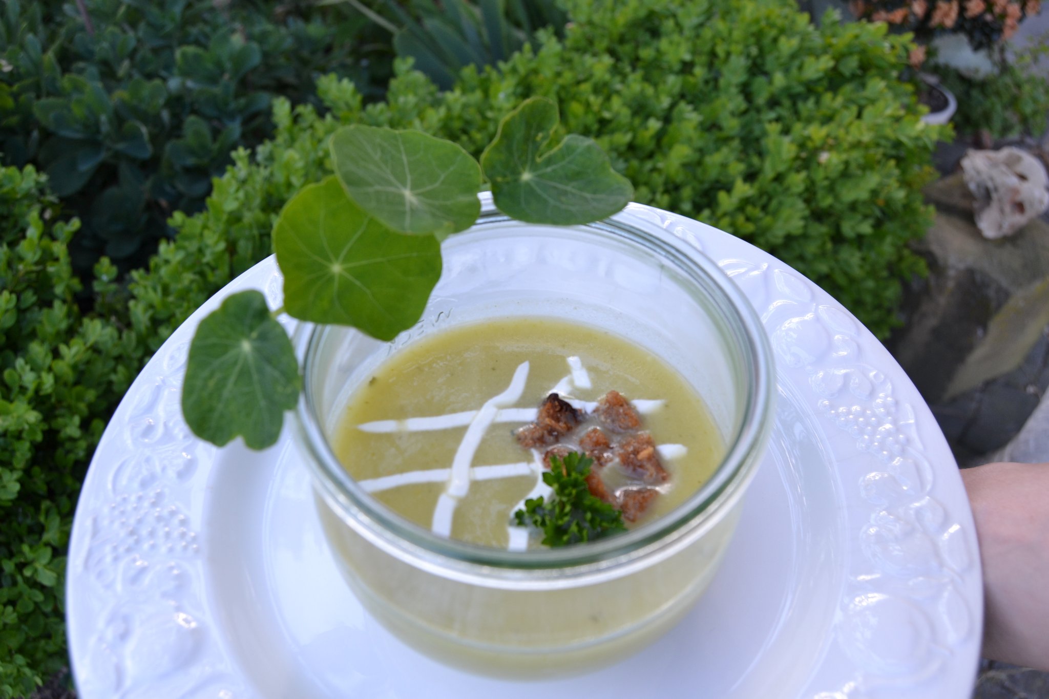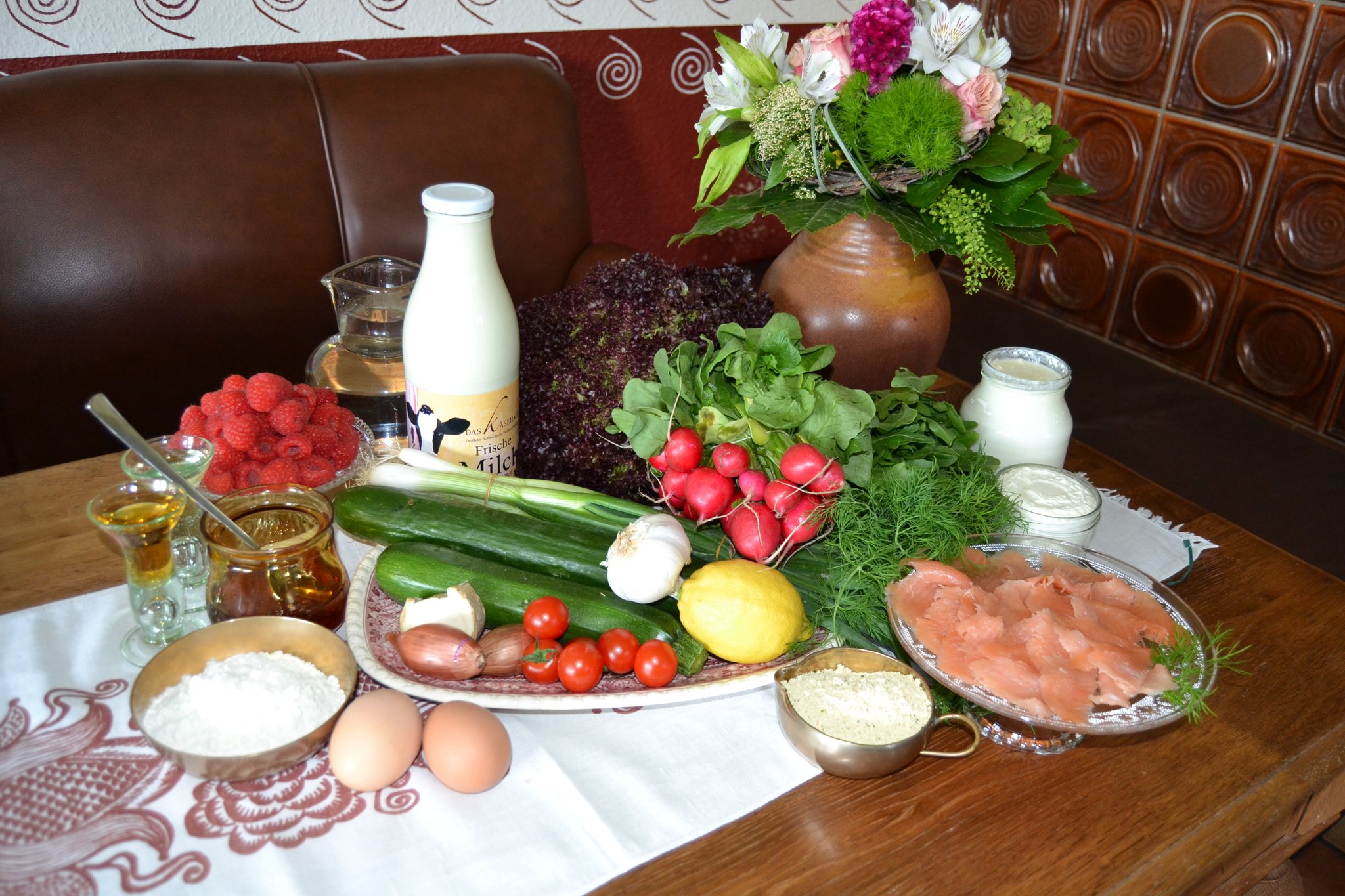 Das Motto ihres 3-Gänge-Menüs: „Leichte Küche für die heißen Tage“. Den Auftakt macht eine kalte Sommersuppe aus Zucchini und Gurke. Es folgen würzige Kräuterpfannkuchen mit einer Meerrettich-Lachs-Füllung. Dazu gibt es einen bunten Salat. Den süßen Abschluss bildet ein fruchtiger Joghurt-Himbeer-Shake.