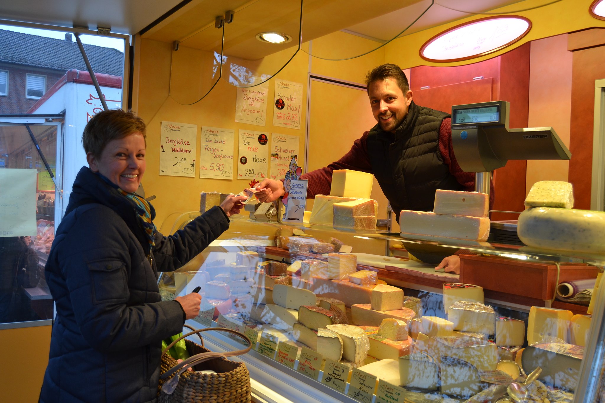 „Sind wir fertig?“, fragen Laya und Noel unisono. „Noch nicht ganz“, sagt Maik Große-Wietfeld, nimmt die grüne Stofftasche und geht auf einen Stand mit Fleischwaren zu. Er fragt nach vier Hähnchenbrustfilets, die prompt auf den Tresen gelegt werden. Noel und Laya können sich eines teilen. Die Zutaten sind bezahlt, die Einkaufstour ist beendet – mit Ausgaben von 16,19 Euro etwas günstiger als gedacht. Die Zutaten für die Vorspeise – Schwarzbrot, Räucher-Aal und Ricotta – hat seine Frau Elisabeth Korte aber auch schon am Donnerstag auf dem Langenberger Wochenmarkt gekauft, gibt Willi Korte zu. Die 25 Euro sind ausgeschöpft.