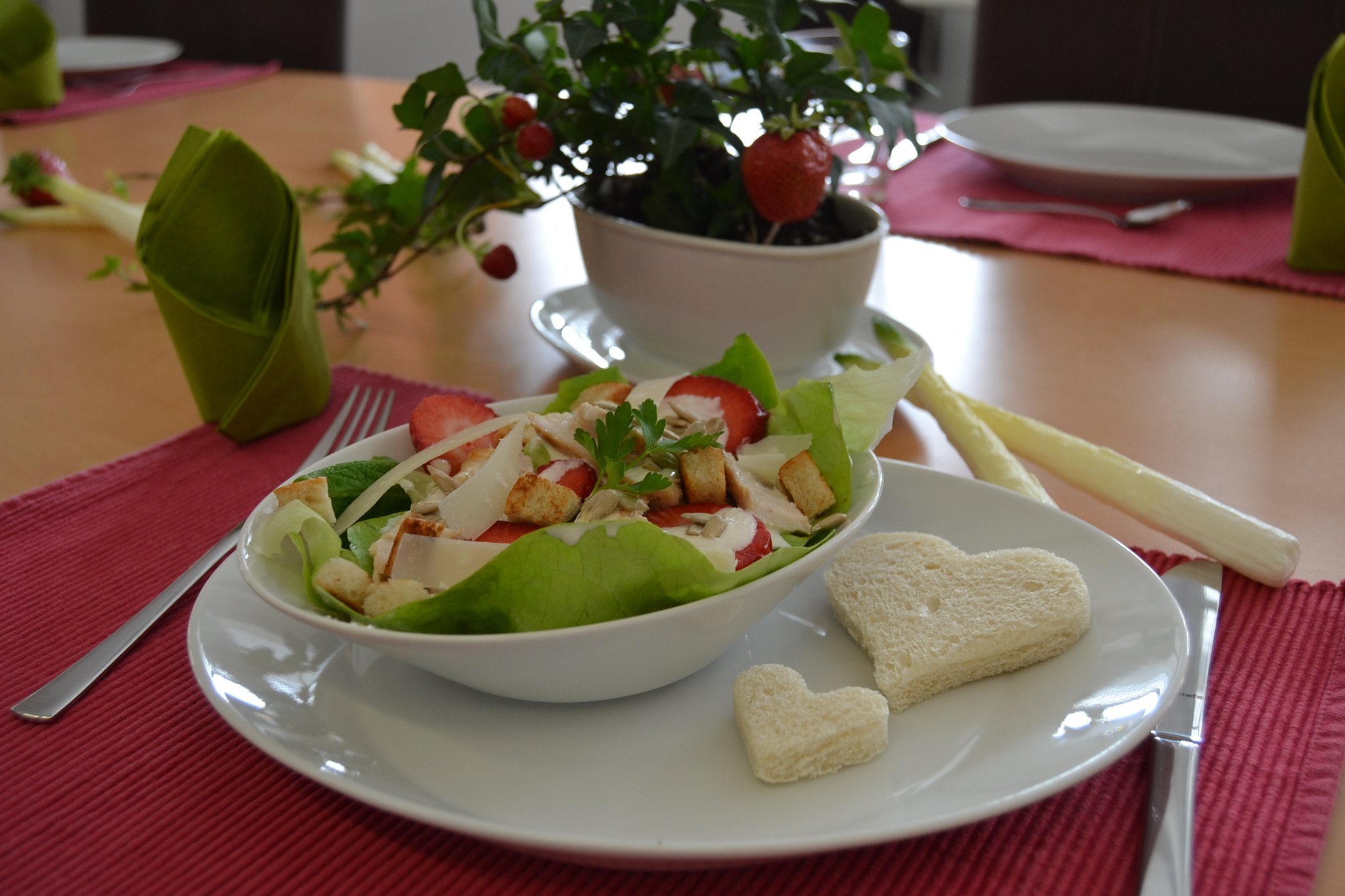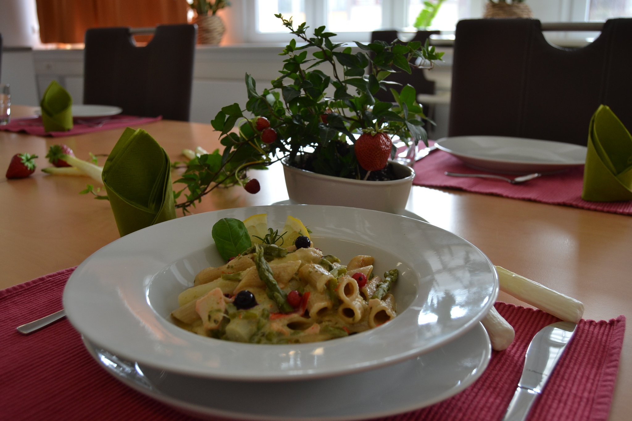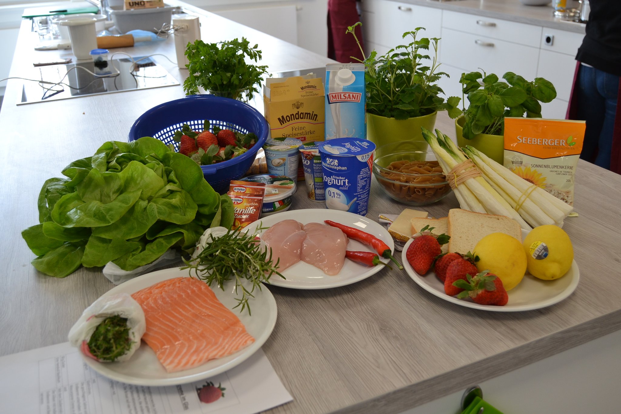 Und dort entstanden drei leckere Gerichte, die zusammen ein vorzügliches Menü bilden. Dabei steht der Frühling mit auf der Menükarte. Denn zum Auftakt servieren die Berufsschüler Kopfsalat mit Hähnchenbrust, Erdbeeren und Parmesan. Angerichtet wird es mit einem Dressing, basierend auf Sauerrahm und Mayonnaise. Für die Hauptspeise haben sich die Nachwuchsköche aus Beckum Penne mit Lachs und grünem Spargel an Kräuterschaum ausgedacht. Den krönenden Abschluss bilden Erdbeeren mit Mascarpone-Joghurt-Creme, serviert in einem Glas.