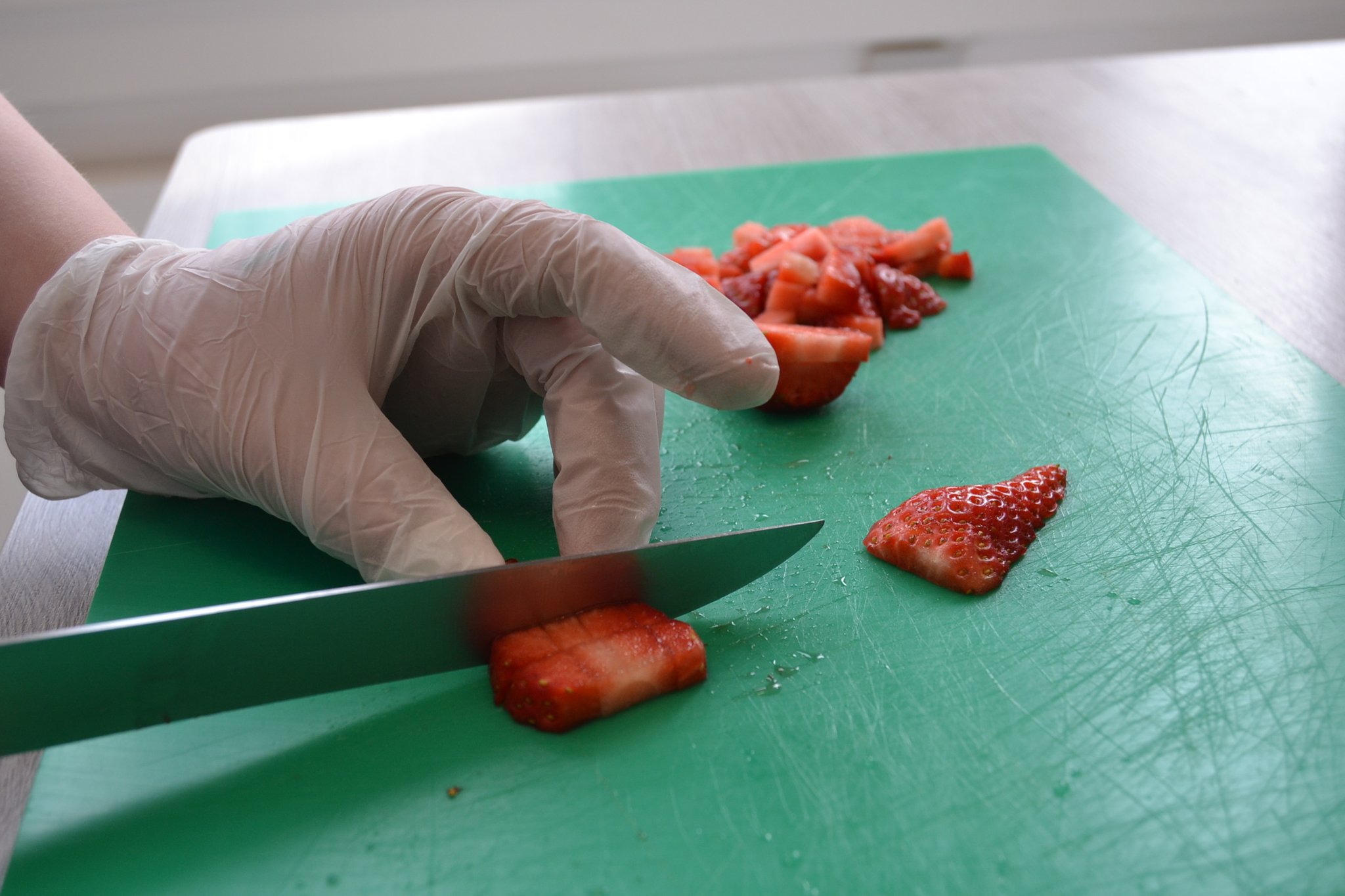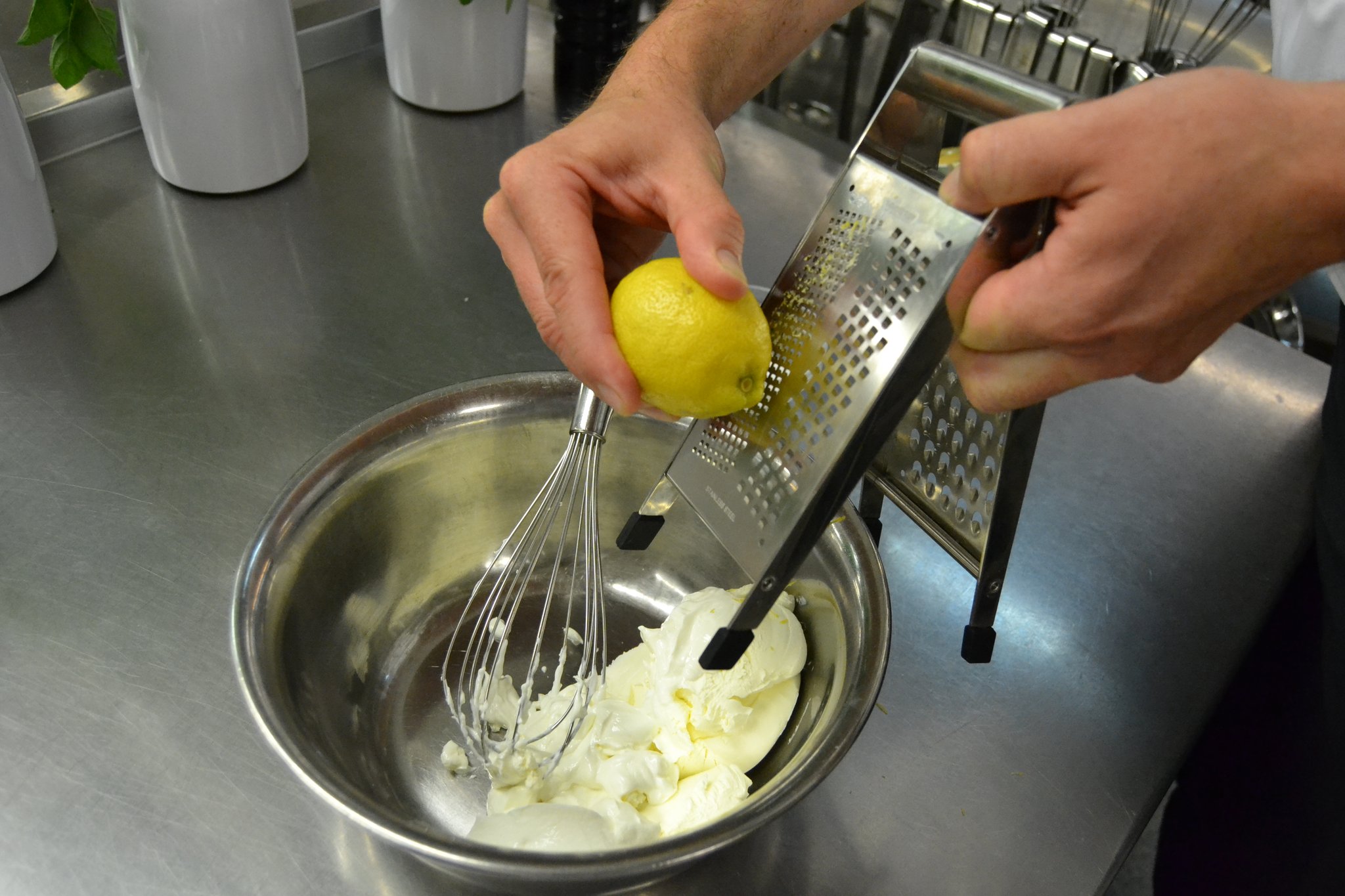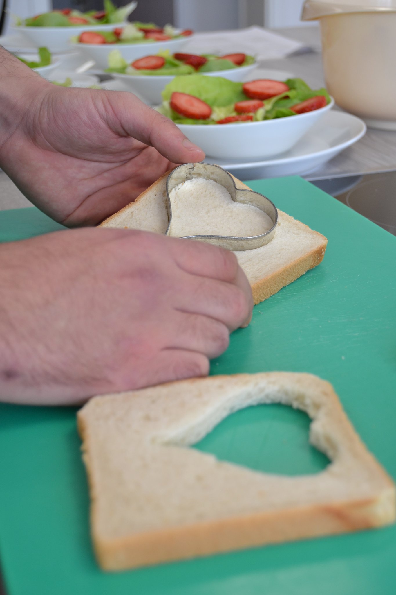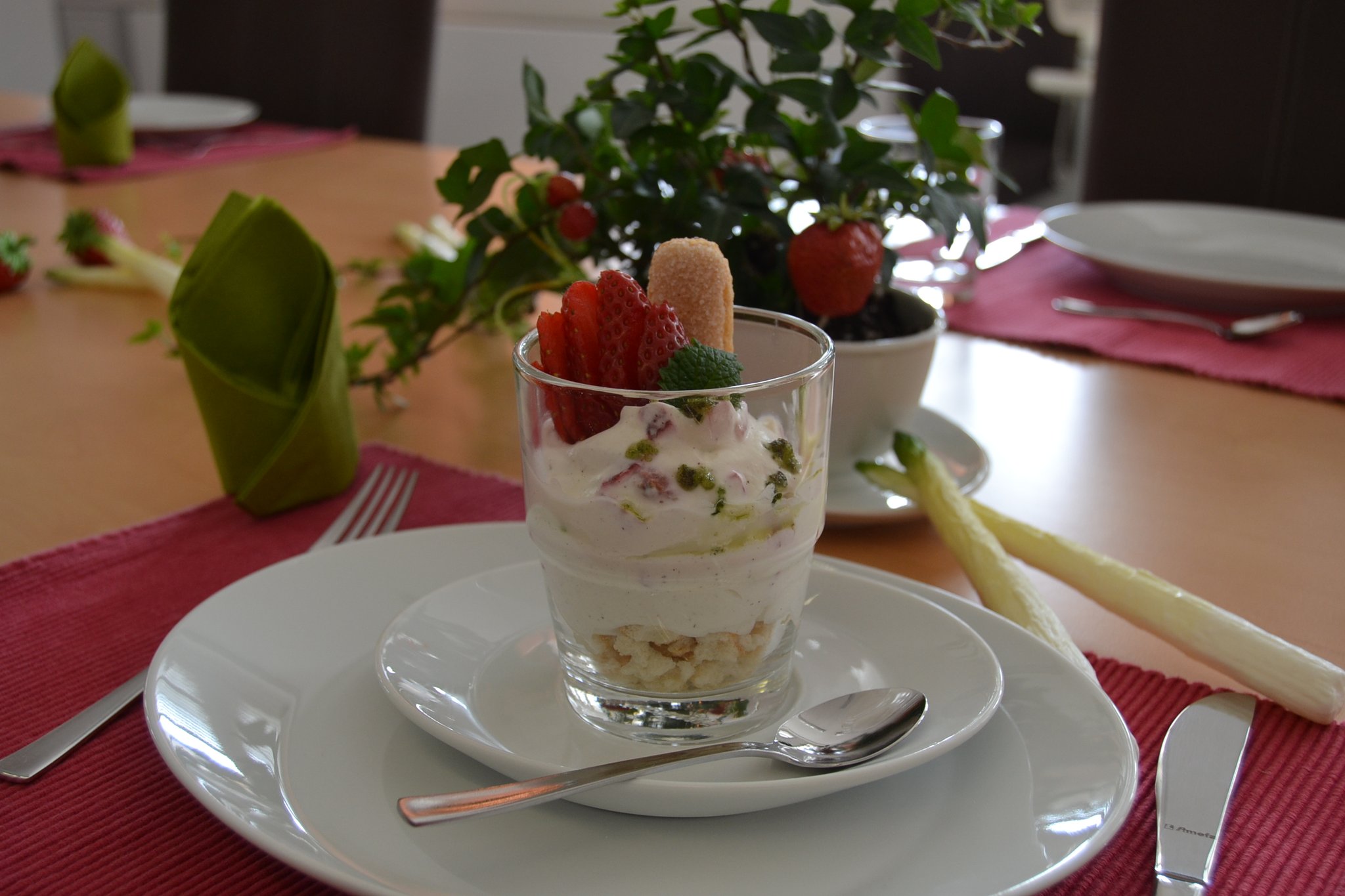 Und dort entstanden drei leckere Gerichte, die zusammen ein vorzügliches Menü bilden. Dabei steht der Frühling mit auf der Menükarte. Denn zum Auftakt servieren die Berufsschüler Kopfsalat mit Hähnchenbrust, Erdbeeren und Parmesan. Angerichtet wird es mit einem Dressing, basierend auf Sauerrahm und Mayonnaise. Für die Hauptspeise haben sich die Nachwuchsköche aus Beckum Penne mit Lachs und grünem Spargel an Kräuterschaum ausgedacht. Den krönenden Abschluss bilden Erdbeeren mit Mascarpone-Joghurt-Creme, serviert in einem Glas.