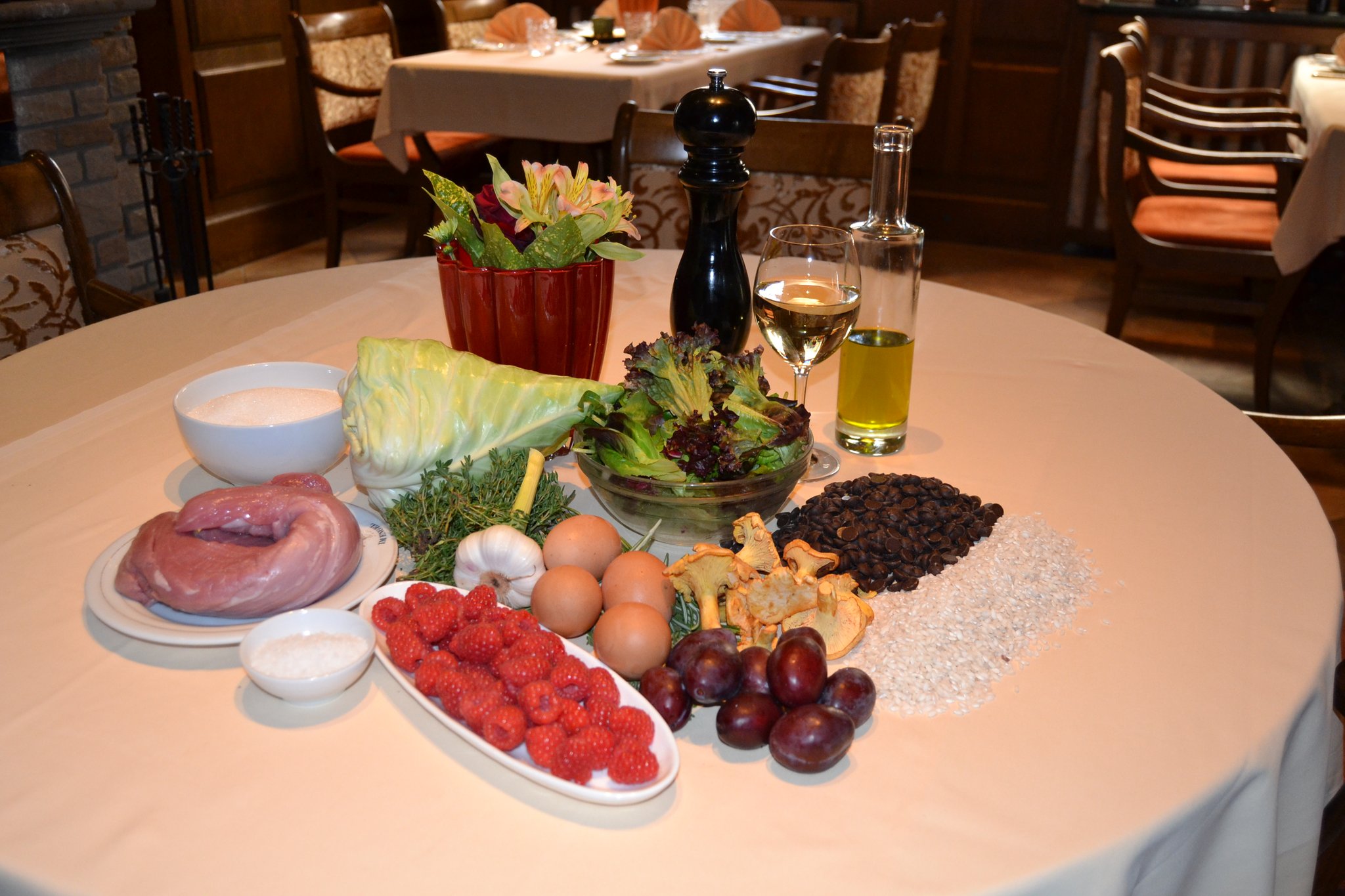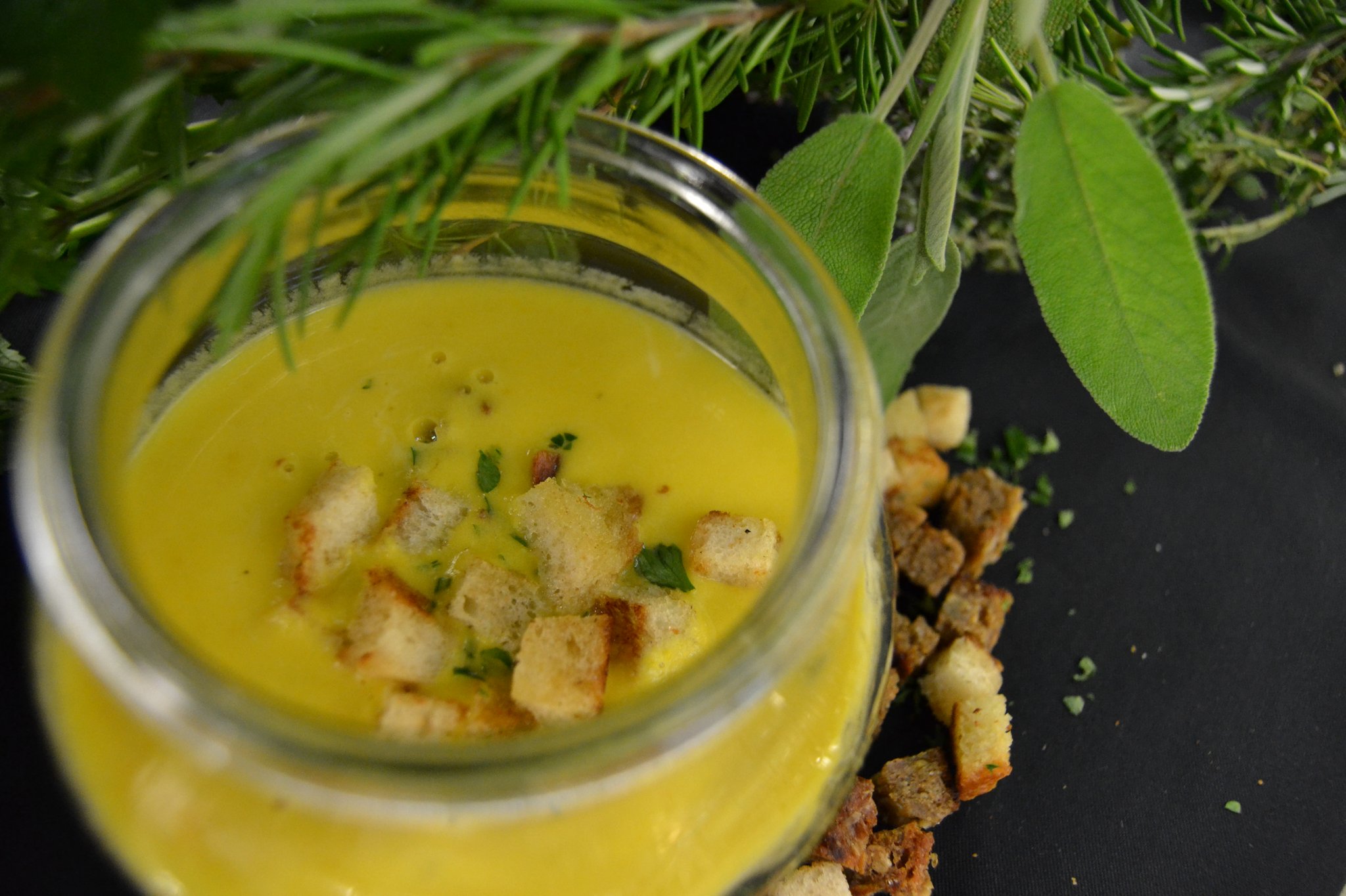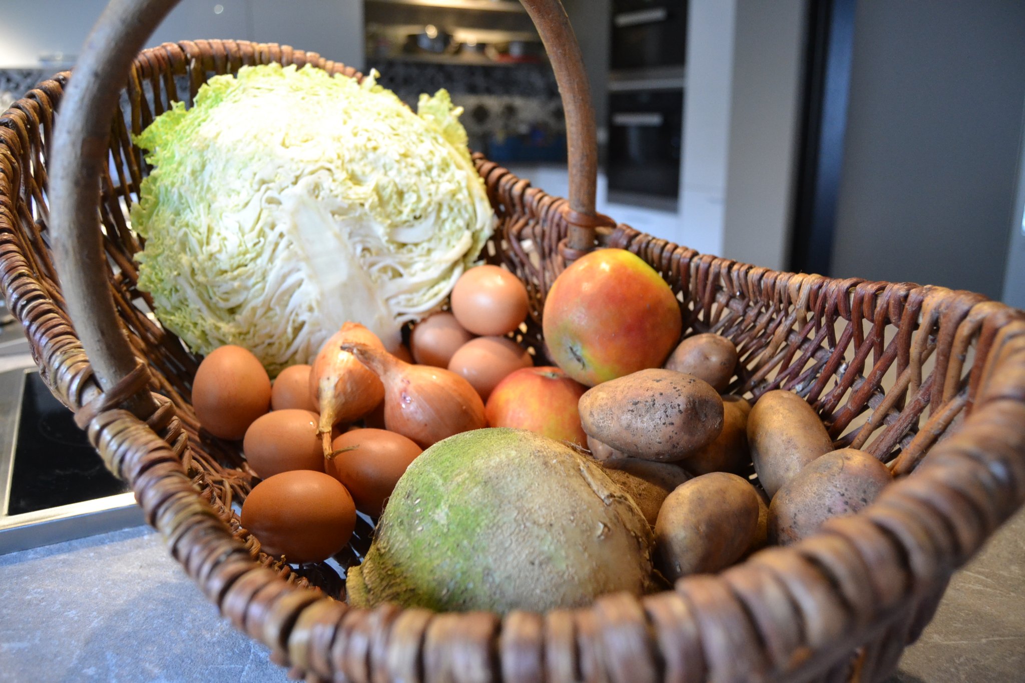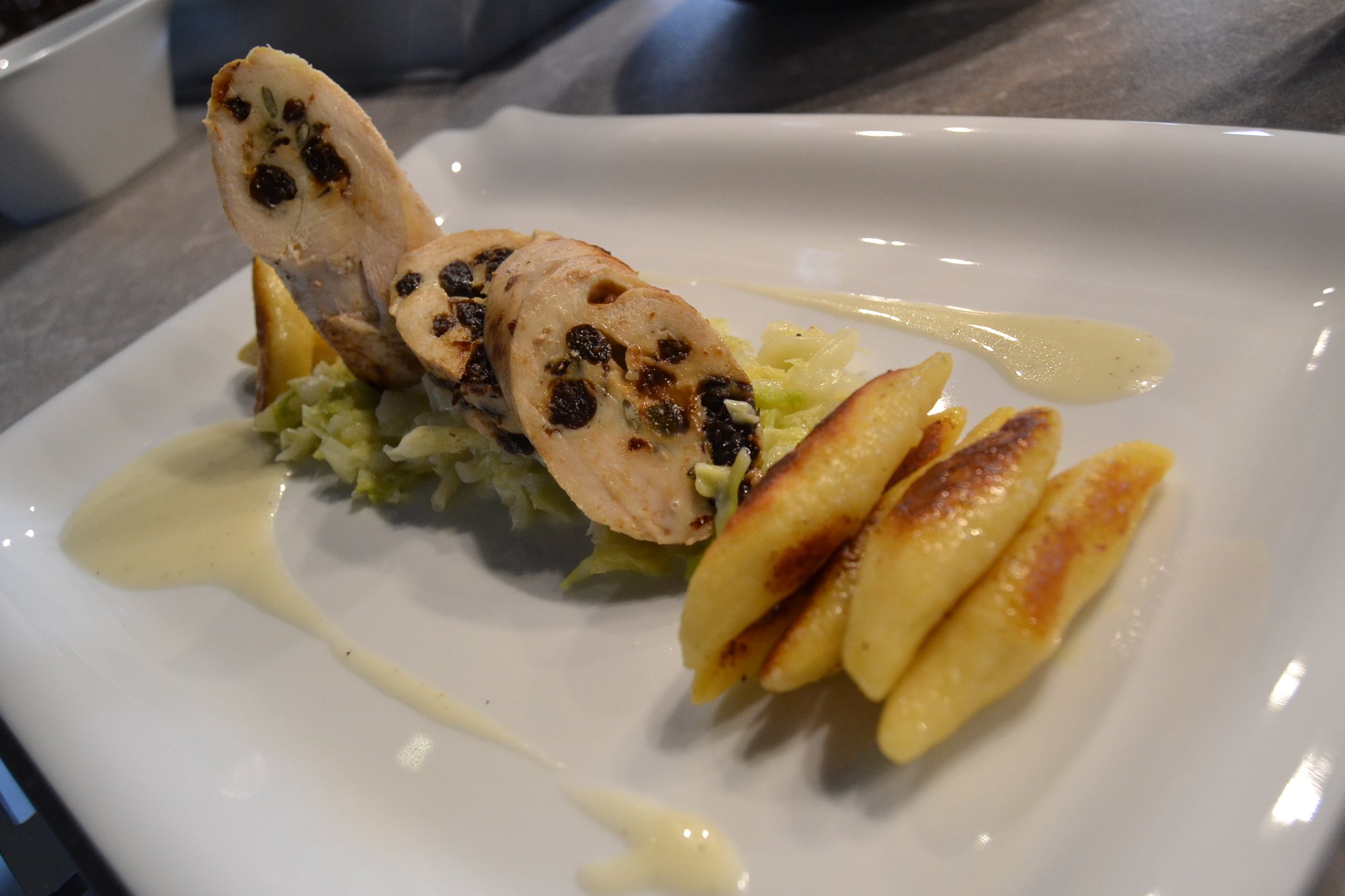 Als Vorspeise serviert er eine kräftig abgeschmeckte Crèmesuppe von der Steckrübe. Die Hauptspeise besteht aus saftiger Roulade von der Hähnchenbrust mit Backpflaumen- und Kürbiskernfüllung an Rahmwirsing und Schupfnudeln. Den süßen Abschluss liefert eine Crème Brûlée mit Zimtapfel.